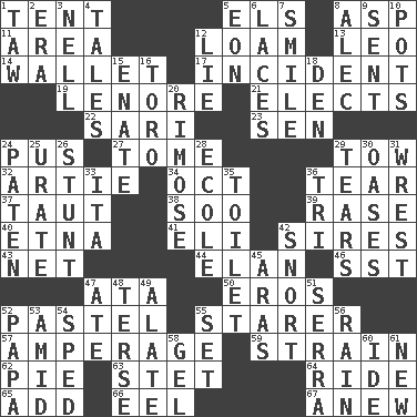 ACROSS 1. Portable shelter 5. Raised railways 8. Viper 11. Type of rug 12. Rich soil 13. Lion 14. Place for singles 17. Event 19. Poe poem 21. Chooses 22. Indian skirt 23. Elected rep. 24. Suppuration 27. Heavy book 29. Pull behind 32. Nick name for Arthur 34. Sep. follower 36. Pull apart 37. Strained 38. "Barney Miller" actor Jack 39. Raze (variant) 40. Inactive volcano in Sicily 41. Connecticut Ivy Leaguer 42. Begets 43. Fish or hair follower 44. Flair 46. Fast jet (abbr.) 47. _ moment's notice (2 wds.) 50. Greek god of love 52. Soft color 55. A viewer who gazes fixedly 57. Electrical Measurement 59. Put through a sieve 62. Sliced dessert 63. Proofreading order 64. Travel on or in a vehicle 65. Find the sum of 66. Snakelike fish 67. Afresh DOWN 1. The 23rd letter of the Hebrew alphabet 2. Period 3. 1994 drama film starring Jodie Foster 4. Lies 5. Period of immesurable duration 6. Shoestrings 7. Grin 8. Actor Baldwin 9. Transmitted 10. Cooking vessels 12. Falsehood 15. Related on the mother's side 16. "Corrida" creature 18. Lair 20. Full of chinks, cracks, or crevices 24. Eucharist need 25. A salt of uric acid 26. Difficult or unusual or dangerous feat 28. Learning spot: Fr. 29. Pulls into pieces 30. Fertile tracts in a desert 31. Obtain by seizing forcibly or violently 33. Call ___ day 35. Bathroom 36. Three (prefix) 42. Derisive sound 45. Caspian sea tributary 47. Had dinner 48. Laconic 49. Having winglike extensions 51. Spanish missionary in California 52. Dad 53. Among 54. Moved rapidly 55. Arrange properly for use 56. Precipitation 58. Set 60. Binary compound 61. ___ Haven, CT