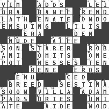 ACROSS 1. Zeal 4. Sums up 8. Luau accessory 11. Mouth or opening 12. The wife of a rajah (variant) 14. Tear apart 15. Thin strip of wood or metal 17. Maternal 18. Southwest Nigerian state 19. Taking place subsequently 21. Ms. Damita and namesakes 23. Period 24. Lair 25. Unadorned 27. Toward shelter 30. Boy, to dad 31. A viewer who gazes fixedly 34. Director Reiner 37. Cuckoo 38. Leaves out 39. Single 40. Plant holder 41. Makes clutter 43. Nine, plus one 44. French philosopher Descartes 45. Greek god of love 47. Australian flightless bird 49. Corporate head (abbr.) 50. A special lineage 52. French poetic form 56. Within a short period 57. Country residence 60. First man 61. Writing tablets 62. Frees from moisture 63. Corn or form start 64. Had dinner 65. Assistant 66. Allow head to fall sleepily DOWN 1. Grand slam 2. SW Asia republic 3. Floor protectors 4. Sports stadium 5. Mild oath, euphamism for damn 6. Heredity factor (abbr.) 7. Put into a specified state 8. Soviet premier 1918-24 9. Conclusions 10. Wedding promise 13. Snakelike fish 14. Hero or heavy, e.g. 16. Became colored 20. Angers 22. Binary compound 25. Words to Nanette 26. A single undivided whole 27. Ascend 28. Allows 29. Celtic language 30. Plant excrement 32. Heavy book 33. So be it 34. Printing process, for short 35. Washington bills 36. Benjamin's nick name 42. Observes 44. Sorrow 46. Roll call or roster of names 47. Wear away 48. Not women's 49. Stop 50. Water vessel 51. Movie disc 52. Downhill vehicle 53. Goddess of spring and wife of Bragi 54. Billionth: prefix 55. Among 56. Health resort 58. Lyricist Gershwin 59. Cards in a Roman deck?