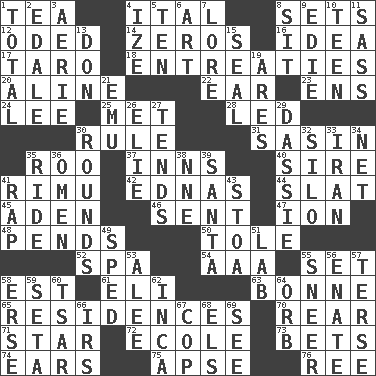 ACROSS 1. Afternoon social gathering 4. Slanted text style (abbr.) 8. Puts into a specified state 12. Wrote a lyric poem 14. Nothings 16. The main thing one is thinking about 17. Edible starchy tuberous root 18. Pleas 20. Place in a line 22. Hearing organ 23. Followers of ems 24. Area sheltered from the wind 25. Was introduced to 28. Directed 30. General guideline 31. Indian antelope 35. Friend of Pooh 37. Restaurants 40. Father 41. Tall New Zealand timber tree 42. Ferber et al. 44. Narrow board 45. Arabian gulf 46. Transmitted 47. Electrically charged atom 48. Depends 50. Lacquered or enameled metalware 52. Health resort 54. American Automobile Association (abbr.) 55. Arrange properly for use 58. Eastern Standard Time (abbr.) 61. Biblical high priest 63. Maid-servant 65. Dwellings 70. Hitchcock's "____ Window" 71. Play the lead 72. Learning spot: Fr. 73. Antes 74. Hearing organs 75. Domed church section 76. To riddle DOWN 1. "_____ Recall" 2. Peak District village in England 3. Nest on high 4. Ending with capital 5. Nine, plus one 6. Tate display 7. Old wives' tales, e.g. 8. Be seated 9. Singer Brickell 10. Adolescent 11. Backtalk 13. Spanish title 15. Lick closed 19. Ancient Greek god of war 21. Australian flightless bird 26. Writer Wiesel 27. Watches over 29. Small ungulate mammals of Africa 30. Periods in a boxing match 32. Grain storage tower 33. SW Asia republic 34. Fish or hair follower 35. Travel on an animal 36. Sign of things to come 38. Compass dir. 39. Before Barbara or Clara 41. Hit sharply and swiftly 43. Portico 49. Hurried 51. Experiment locale 53. Toward shelter 55. Contemptuous expression 56. Related on the mother's side 57. Laconic 58. Celtic language 59. Bristle 60. Russian ruler of old 62. South American Indian 64. Globe 66. Big collection agency 67. Police officer (slang) 68. Raised railways 69. Observe