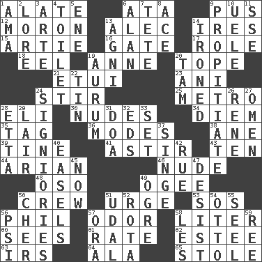 ACROSS 1. Having winglike extensions 6. _ moment's notice (2 wds.) 9. Suppuration 12. Person of subnormal intelligence 13. Actor Baldwin 14. Angers 15. Nick name for Arthur 16. Yard entry 17. Hero or heavy, e.g. 18. Snakelike fish 19. Queen of England 1702-14 20. Drink excessively 21. Needle case 23. Black tropical American cuckoo 24. Disorderly outburst 25. Paris' subway 28. Biblical high priest 30. Unadorned figures 34. South Vietnam president (1954) 35. Label 36. Methods 38. One (Scot) 39. Prong on a fork 41. Moving about 43. Nine, plus one 44. Believer in; advocate of (suffix) 46. Naked 48. Bear (Spanish) 49. Double curve, resembling the letter S 50. Group working together 51. Goad 53. Distress signal 56. Silvers or Donahue 57. Aroma 58. 61 cubic inches 60. Perceives with the eye 61. Assign a rank or rating to 62. First name in cosmetics 63. Big collection agency 64. Chicken ___ king 65. Took without asking DOWN 1. Wet nurse (var.) 2. Old wives' tales, e.g. 3. Johnson of "Laugh-In" 4. Bathroom 5. Compass dir. 6. Actor Alda or Thicke 7. False hair 8. Adept person 9. Appease 10. Ubangi River tributary 11. Compass dir. 13. Hindu god of fire 14. Pressed 19. Gold (Symbol: Au) 20. Scottish cap 22. Metal container 24. Seigniories (variant) 26. French philosopher Descartes 27. Sign of something about to happen 28. Singer James 29. Den 31. ___ good deed 32. Begley and Asner 33. Put into a specified state 37. Burn superficially 40. Artist's stands 42. Sorrow 45. Immediately 47. Cease 49. Legendary monster 50. "Mermaids" star 51. Hereditary estate 52. Roll call or roster of names 54. "Beetle Bailey" pooch 55. Stitch closed the eyes of (a falcon) 56. 23rd letter of the Greek alphabet 57. Mouth or opening 58. French article 59. To sift