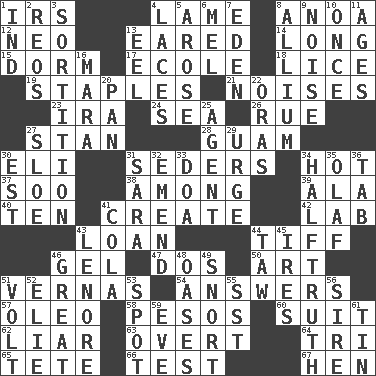 ACROSS 1. Big collection agency 4. Unable to walk 8. Small Philippine buffalo 12. Modern: prefix 13. Having ears or earlike features 14. Yearn 15. Dormintory (informal) 17. Learning spot: Fr. 18. Louse (plural) 19. Paper fasteners 21. Annoying sounds 23. Retirement account (abbr.) 24. Ocean 26. Regret 27. Comedian Laurel of Laurel & Hardy 28. Island territory of the United States 30. Connecticut Ivy Leaguer 31. Spring feasts 34. Being at a high temperature 37. "Barney Miller" actor Jack 38. Amid 39. Chicken ___ king 40. "___ Little Indians" 41. Make 42. Experiment locale 43. Grant temporary use of 44. Small quarrel 46. Set 47. Two (Sp.) 50. Tate display 51. Actresses Bloom and Felton 54. Replies (to) 57. Butter sub 58. Mexican monetary units 60. Set or collection 62. One who doesn't tell the truth 63. Unconcealed 64. Three (prefix) 65. Wig 66. Trial 67. Layer DOWN 1. Working for oneself (abbr.) 2. Vintage cars 3. Conclusion 4. Shoestrings 5. Came up 6. Cartoonist voice _ Blanc 7. Paradise 8. Plant genus of onion and garlic 9. Annoying sound 10. At one time in the past 11. Grows older 13. Snakelike fish 16. Hindu Mythology: god of death 20. Baking dish 22. Mouths or openings 25. Representative 27. A type of plum 29. Goad 30. Eastern Standard Time (abbr.) 31. "Two Mules for Sister ____" 32. Make improvements or corrections to 33. ___ good deed 34. Not exactly gospel 35. Norwegian king 36. Keyboard key 41. Root beer relative 43. Poe poem 44. The 23rd letter of the Hebrew alphabet 45. Angers 46. Relatively large 48. Fertile tracts in a desert 49. Derisive sound 51. Electrical Unit 52. Writer Wiesel 53. Specific locale 55. Fast jet (abbr.) 56. Male parent of an animal 59. First lady 61. Metal container