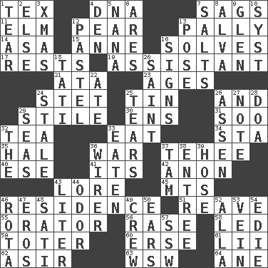 ACROSS 1. John Ritter's dad 4. Heredity factor (abbr.) 7. Settles 11. Shade tree 12. Lightbulb-shaped fruit 13. Friendly 14. White ___ sheet 15. Queen of England 1702-14 16. Finds the solution 17. Musical pauses 19. Aide 21. "One Day ___ Time" 23. Eons 24. Proofreading order 25. Shallow baking pan 26. Plus 29. Vertical member of a panel or frame 30. Followers of ems 31. "Barney Miller" actor Jack 32. Afternoon social gathering 33. Erode 34. R.R. building 35. Actor Linden 36. Armed conflict 37. Giggle 40. Compass dir. 41. It is 42. Soon (poet.) 43. Old wives' tales, e.g. 45. Mountains (abbr.) 46. Home 51. Break or tear apart 55. Speaker 56. Raze (variant) 58. Directed 59. Carrier 60. Celtic language 61. Cards in a Roman deck? 62. SW Saudi Arabia district 63. Compass dir. 64. One (Scot) DOWN 1. Pull into pieces 2. Otherwise 3. Dec. holiday 4. Lair 5. Nanny 6. Ancient Greek god of war 7. Table seasonings 8. Inventor's middle name 9. Small, secluded valley 10. System (abbr.) 12. Soft color 13. Introduce or present, as a question 16. Attaches a signature 18. Jacques of French films 20. Inhabitant of Heaven 22. Had dinner 24. Showing deterioration from age 25. Pulls apart 26. NE Netherlands city 27. Short letter 28. ___ good deed 29. Oceans 32. Definite Article 33. Consumed 36. One who wires 37. Scottish cap 38. Main course 39. Flexible conduit 43. 61 cubic inches 44. Scent 46. Round or rotation of duties 47. Greek god of love 48. Suttee (variant) 49. Ship's personnel 50. Hearing organs 52. Silent film actress Nazimova 53. Distinctive style or manner 54. Singer Brickell 57. Compass dir.