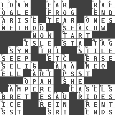 ACROSS 1. Grant temporary use of 5. Ewer handle 8. Actress Charlotte 11. Stare at amorously 12. Tree-dwelling hopper 14. Conclusion 15. Ascend 17. Pull into pieces 18. Singles 19. Mode 21. Manatee 23. Immediately 25. Small pie 26. Capri or Wright 27. R.R. building 28. Label 31. Symbol (abbr.) 33. Three (prefix) 35. Vertical member of a panel or frame 37. Ooze 38. And so on (abbr.) 40. Celtic language 41. Former Milwaukee Brewers owner Bud 43. Auto club (abbr.) 45. Modern: prefix 46. Pipe bend 47. Tate display 50. Inconspicuous attention getter 52. Brightly colored fish 53. A female animal or person 54. Electrical Unit 56. Artist's stands 61. Cy Young winner Saberhagen 62. Son of Isaac 65. Amusement-park features 66. Frozen water 67. It's straight from the horse's mouth 68. Monthly bill 69. Fast jet (abbr.) 70. Indian title of respect (Mr.) 71. Conclusions DOWN 1. Rich soil 2. Legendary monster 3. Came down and settled, as after flight 4. Soft 5. Bank Draft (abbr.) 6. "We ___ not amused" (Victoria) 7. Ridicules or criticizes harshly 8. Western Nevada city 9. Afresh 10. Begley and Asner 13. Relatively large 16. Immeasurably long periods of time 18. Sep. follower 20. Stupid person 22. Caspian sea tributary 24. We are 26. Body of Kaffir warriors 28. Become fatigued 29. In addition 30. Unit of force equal to gravity 31. Sew up the eyelids of hawks and falcons 32. Shout 34. Call ___ day 36. Portable shelter 37. Compass dir. 39. Balmoral and tarboosh 42. Yawn 44. American tennis player Robert 48. More valued for its uncommonness 49. College papers 51. Singe 52. Elect 54. Curves 55. Confront 57. Father 58. Genesis locale 59. Grant temporary use of 60. Fast planes 61. Again 63. Wind 64. Corn or form start