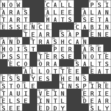 ACROSS 1. At this time 4. Give a ring to 8. Air pressure measure (abbr.) 11. Caspian sea tributary 13. Toward shelter 14. ____ Jay Lerner 15. Small pie 16. Floor coverings 17. Bristle 18. Core 21. Apartment or room in a ship 22. Lacerate 23. Plant excrement 25. Compass dir. 26. Also 29. File 13 32. Damp 34. For each 35. "We ___ not amused" (Victoria) 38. Inconspicuous attention getter 39. Laconic 41. Short letter 43. Environmental prefix 44. Mouth or opening 45. Table seasonings 46. One to whom something is allotted 50. Consume 51. Double-curved letter 54. Consenting reply 55. Coop moms 57. Took without asking 59. Stimulate to action 63. "Change" in Tahitian 64. Distinctive style or manner 67. One of the Great Lakes 68. Otherwise 69. International (abbr.) 70. Letter starter 71. Perceive with the eye 72. Whirlpool 73. Insidious DOWN 1. Nathan's nickname 2. Mouths or openings 3. Armed conflicts 4. Device for capturing images 5. Wing 6. Allow 7. French article 8. First-year military academy student 9. Smooth fabric 10. Lacking in sense or substance 12. Proofreading order 14. White ___ sheet 19. Remaining after all deductions 20. Automobile 21. Tax preparer (abbr.) 23. "______ My Girl" (Turtles hit) 24. 43,560 square feet 26. Electrical Unit 27. Olfactory organ 28. Flat circle 30. Small fatty European fish 31. Grandmother 33. Portico 36. Hero or heavy, e.g. 37. Singer James 39. Lacquered or enameled metalware 40. Greek god of love 42. Eastern Standard Time (abbr.) 45. Elected reps. 47. Sodium hydroxide 48. Without viscosity 49. Car or cant ending 51. _____ Park, CO 52. Showing deterioration from age 53. Boozer 56. Drove too fast 58. Untruth 60. Angers 61. Monetary unit of Yemen 62. Suggestive of the supernatural 64. Compete 65. Conclude 66. It would