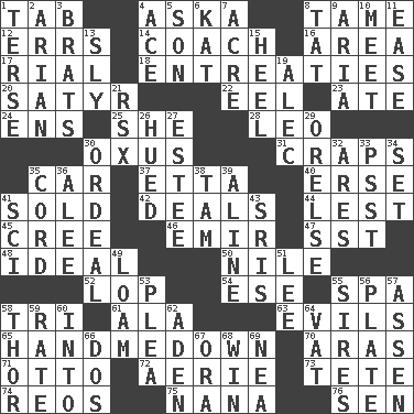 ACROSS 1. Keyboard key 4. "____ silly question..." 8. Docile 12. Blunders 14. Team commander 16. Length times width 17. Monetary unit of Yemen 18. Pleas 20. Man with strong sexual desires 22. Snakelike fish 23. Had dinner 24. Followers of ems 25. A female animal or person 28. Lion 30. Amu Darya 31. Dice game 35. 4-wheeled motor vehicle 37. Singer James 40. Celtic language 41. Disposed of to a purchaser 42. Allots cards 44. For fear that 45. Algonquian 46. Arab leader 47. Fast jet (abbr.) 48. Perfect 50. The longest river in the world 52. Trim (branches) 54. Compass dir. 55. Health resort 58. Three (prefix) 61. Insect wing 63. Vices 65. Sleeping bag shop? 70. Caspian sea tributary 71. "Beetle Bailey" pooch 72. Nest on high 73. False hair 74. Vintage cars 75. Grandmother 76. Elected rep. DOWN 1. Laconic 2. Believer in; advocate of (suffix) 3. Naughty children 4. Adept person 5. Manchild 6. Krazy ___ of comics 7. 43,560 square feet 8. Make lace 9. Roberta Peters solo 10. Rendezvous 11. Comfort 13. Playfully artful 15. Person who is morally reprehensible 19. Actor Baldwin 21. Acura sports coupe 26. Took on color 27. First name in cosmetics 29. Threatening words 30. Severe or trying experience 32. Ancient Greek god of war 33. Inconspicuous attention getter 34. Put into a specified state 35. Drawstring 36. Toward shelter 38. Scottish cap 39. Place in a line 41. _-fi 43. Indian titles of respect 49. Rich soil 51. Area sheltered from the wind 53. Entreaty 55. Titles for men of rank and authority 56. Food holder 57. NE Netherlands city 58. Son of Odin 59. Assign a rank or rating to 60. To the inside or interior of 62. Arabian gulf 64. Large container 66. Two (Sp.) 67. Mouth or opening 68. Victory 69. Teachers' org.