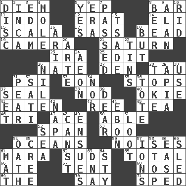 ACROSS 1. South Vietnam president (1954) 5. Slangy assent 8. Tavern 11. _ china 12. Part of Q.E.F. 14. Biblical high priest 15. Any of the three canals of the cochlea 17. Backtalk 18. Necklace unit 19. Device for capturing images 21. Titan orbits this 23. Retirement account (abbr.) 25. Prepare for publication 26. Nathan's nickname 27. Lair 28. The 19th letter of the Greek alphabet 31. 23rd letter of the Greek alphabet 33. Period of immesurable duration 35. Constricts 37. Lick closed 38. Allow head to fall sleepily 40. Migrant worker of the '30s 41. Eroded 43. To riddle 45. Afternoon social gathering 46. Three (prefix) 47. Adept person 50. Competent 52. Connect, as a bridge 53. Friend of Pooh 54. Seas 56. Annoying sounds 61. Hindu Mythology: god of death 62. Soap bubbles 65. Add up to 66. Had dinner 67. Portable shelter 68. Characteristic smell of wine 69. Definite Article 70. Declare 71. Hurried DOWN 1. Plate 2. South American Indian 3. Dutch treat 4. Undercover agent 5. Consenting reply 6. Epoch 7. Went by 8. Fermented drink made from hops 9. Actor Alda or Thicke 10. To free from 13. Sadhe (variant) 16. Roberta Peters solo 18. Yet 20. Johnson of "Laugh-In" 22. Canisters 24. Age 26. Mediterranean tributary 28. Puff or smoke 29. Capital of Western Samoa 30. Purpose 31. Lightbulb-shaped fruit 32. Suttee (variant) 34. Or not 36. Carry 37. Put into a specified state 39. Letter starter 42. California wine valley 44. Inky black, to poets 48. 2nd pers. sing. pres. of can (arch.) 49. Takes place subsequently 51. Spoils 52. Ocean 54. Pledge 55. Algonquian 57. Charged particles 58. Cease 59. Comfort 60. Downhill vehicle 61. Floor protector 63. Heredity factor (abbr.) 64. Filthy place