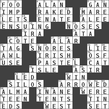 ACROSS 1. Egg _ yung 4. Actor Alda or Thicke 8. Separate the seeds from cotton 11. Naughty child 12. Moved through 14. Female horse 15. Allows 17. Maternal 18. Toward shelter 19. Taking place subsequently 21. Olfactory organs 23. Lyricist Gershwin 24. _ moment's notice (2 wds.) 25. ____ d'Azur (French Riviera) 27. Having or resembling wings 30. Label 31. Sounds asleep 34. Whopper 37. Leather borer 38. From or relating to Ireland 39. Order of Saint Francis (abbr.) 40. Purpose 41. Soft color 43. Domesticated feline 44. Capri or Wright 45. SW Saudi Arabia district 47. Directed 49. Acquire through effort 50. Grain storage towers 52. Moved like an arrow 56. _ mater 57. Silly 60. Past tense of be (plural) 61. Adolescent 62. Portable shelters 63. Metal container 64. Begley and Asner 65. 270 degrees 66. Arrange properly for use DOWN 1. Do some clerical work 2. Sign of things to come 3. Elects 4. Sports stadium 5. Austrian-born American filmmaker Fritz 6. Alias (abbr.) 7. Fish or hair follower 8. An organ shaped like a helmet 9. Ancient Greek god of war 10. Born 13. Lair 14. Vertical spar for supporting sails 16. Costume for a special activity 20. Angers 22. Rowing implement 25. Crow sounds 26. Stare 27. Get up 28. For fear that 29. American tennis player Robert 30. The 19th letter of the Greek alphabet 32. Cuts off 33. Relating to the mouth 34. Venues 35. Austrian river, tributary to the Danube 36. Newt 42. Den 44. Wedding promise 46. Overwhelm 47. Citrus fruits 48. Enthusiasm 49. Obtain by seizing forcibly or violently 50. Downhill vehicle 51. Be seated 52. Pismires 53. Moistens 54. 4th largest of the Great Lakes 55. Incision 56. Had dinner 58. ___ Haven, CT 59. One (Scot)