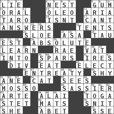 ACROSS 1. Falsehood 4. Egg locale 8. Chewing product 11. Spoken 13. Butter sub 14. Roberta Peters solo 15. Edible starchy tuberous root 16. Is not 17. Patter 18. Responds (to) 21. Portable shelters 22. A type of plum 23. White ___ sheet 25. The 19th letter of the Greek alphabet 26. Eastern Standard Time (abbr.) 29. Utter; complete 32. Memorize 34. Actress Charlotte 35. Large container 38. To the inside or interior of 39. Practice fights 41. Angers 43. HTML Container Element 44. Ingest 45. Opt 46. Plea 50. Like a shrinking violet 51. One (Scot) 54. Feline 55. Perceives with the eye 57. With motion or animation 59. More lively and spirited 63. Johnson of "Laugh-In" 64. Jai ____ 67. Ancient Roman robe 68. Proofreading order 69. Floor coverings 70. In a ____ (agitated or irritated) 71. A female animal or person 72. Collude with 73. Compass dir. DOWN 1. Globular water bottle used in Asia 2. SW Asia republic 3. Hearing organs 4. Annoying sounds 5. Raised railways 6. Elected rep. 7. Small child 8. Monetary aid 9. National forest in Provo, Utah 10. Taiwanese island in East China Sea 12. Coldest temperatures 14. Adept person 19. Liveliness 20. Director Reiner 21. Make lace 23. Having or resembling wings 24. Takes to court 26. Biblical high priest 27. Post 28. Jacques of French films 30. Speak pompously 31. Morally bad or wrong 33. Be footloose 36. Ancient Greek god of war 37. Technology 39. Bristle 40. Piece 42. Filthy place 45. Snake ____ (dice throw) 47. Non-commissioned officer (abbr.) 48. Help 49. Beverage made from leaves 51. Collect or gather 52. 0 degrees 53. First name in cosmetics 56. Fast planes 58. Arrange properly for use 60. Charged atoms 61. Armor plate that protects the chest 62. Pace 64. Housemaid (var.) 65. Experiment locale 66. Had dinner