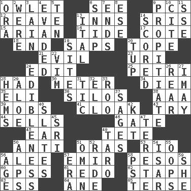 ACROSS 1. A small or young owl 6. Observe 9. Personal Computers (abbr.) 12. Rob, plunder, or pillage 13. Restaurants 14. Indian titles of respect 15. Believer in; advocate of (suffix) 16. Event that recurs at intervals 17. ____ d'Azur (French Riviera) 18. Conclude 19. Plant excrements 20. Drink excessively 21. Morally bad or wrong 23. RI univ. 24. Prepare for publication 25. _ dish (used to culture cells) 28. Possessed 30. Distance measurement 34. South Vietnam president (1954) 35. Biblical high priest 36. Grain storage towers 38. American Automobile Association (abbr.) 39. Disorderly crowds 41. Loose outer garment 43. Attempt to accomplish something 44. Makes a sale 46. Yard entry 48. Hearing organ 49. False hair 50. Opposed to 51. Mouths or openings 53. River (Sp.) 56. Toward shelter 57. Independent ruler or chieftain 58. Mexican monetary units 60. Global Positioning Systems (abbr.) 61. Make new 62. Staphylococcus 63. Double-curved letter 64. One (Scot) 65. Laconic DOWN 1. Mouth or opening 2. Past tense of be (plural) 3. (Had) reclined 4. Eluded 5. Nine, plus one 6. Sever or remove by pinching or nipping 7. Extremities 8. Compass dir. 9. Conciliate 10. Quote 11. Compass dir. 13. Slanted text style (abbr.) 14. Tallied 19. Settings 20. Uncastrated adult male sheep 22. Zeal 24. The property of being fit to eat 26. Buttocks 27. "If ____ say so..." 28. Is hesitant and indecisive 29. _ vera 31. Nervous spasm 32. Pipe bend 33. Friend of Pooh 37. Gurus 40. Chalkboards 42. Krazy ___ of comics 45. Indian title of respect (Mr.) 47. Cylindrical with tapered ends 49. Edible starchy tuberous root 50. High mountains 51. Sign of things to come 52. Travel on an animal 54. Austrian river, tributary to the Danube 55. I made a mistake 56. Personal question 57. Epoch 58. Pacific Standard Time (abbr.) 59. A female animal or person