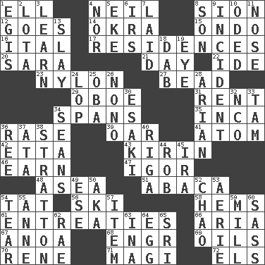 ACROSS 1. Pipe bend 4. Famous astronaut Armstrong 8. The Jewish people; Israel 12. Moves 14. Gumbo ingredient 15. Southwest Nigerian state 16. Slanted text style (abbr.) 17. Homes 20. "Two Mules for Sister ____" 21. 24 hours 22. Binary compound 23. Thermoplastic polyamide 27. Necklace unit 29. Mitch Miller's instrument 31. Monthly bill 34. Connects, as a bridge 35. South American Indian 36. Raze (variant) 39. Rowing implement 41. Smallest unit of an element 42. Singer James 43. Japanese brewing company 46. Merit 47. Russian composer Stravinsky 48. Toward the sea 51. Phillipine bananalike plant 54. Make lace 56. What Jean-Claude Killy likes to do 58. Folds over and sews together 61. Pleas 66. Roberta Peters solo 67. Small Philippine buffalo 68. Engineer (abbr.) 69. Petroleums 70. French philosopher Descartes 71. Wise men 72. Raised railways DOWN 1. The front part of a cuirass 2. Globular water bottle used in Asia 3. Acquire or gain knowledge or skills 4. Or not 5. Supplement with great effort 6. Big collection agency 7. Put down 8. Manchild 9. Event 10. Wrote a lyric poem 11. Olfactory organ 13. Kill 18. Small moist lump or mass 19. Sight organ 24. Trim (branches) 25. Chief or king in Benin or Nigeria 26. Words to Nanette 28. Believer in; advocate of (suffix) 30. 1973 Nobel Price Winner (Physics) Leo 32. Non-commissioned officer (abbr.) 33. Scottish cap 34. Actors Connery and Penn 36. Portuguese money of account (variant) 37. "One Day ___ Time" 38. Ski resort town in Vermont 40. Port city in Latvia 44. Director Reiner 45. Retirement account (abbr.) 49. Compass dir. 50. Alias (abbr.) 52. US Secretary of Labor Elaine L. _ 53. Nest on high 54. Lacerate 55. Queen of England 1702-14 57. A whole individual unit 59. Place where flour is made 60. Backtalk 62. Actress Charlotte 63. _ tizzy (2 wds.) 64. Ovum 65. _ Lanka