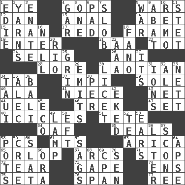 ACROSS 1. Sight organ 4. Republicans 8. Armed conflicts 12. Daniel's nick name 13. Of or related to the anus 14. Collude with 15. SW Asia republic 17. Redecorate 18. Movie unit 19. Keyboard key 21. Sound made by sheep 23. Small child 24. Major League Baseball Commissioner Bud 26. Cuckoo 28. Old wives' tales, e.g. 30. Of or relating to Laos or its people 34. Bar bill 37. Body of Kaffir warriors 39. Flatfish 40. Insect wing 41. Sibling's daughter 43. Fish or hair follower 44. Ubangi River tributary 46. Long journey 47. Put into a specified state 48. Winter's stalactites 51. False hair 54. Clumsy lout 55. Allots cards 58. Personal Computers (abbr.) 61. Mountains (abbr.) 63. N. Chile seaport 65. Lowest deck of a ship 67. Arches 71. Halt 72. Separate forcefully 73. Stare wonderingly 74. Followers of ems 75. Stalk of a moss capsule 76. Connect, as a bridge 77. To riddle DOWN 1. Singer Brickell 2. Entertaining tales 3. Related on the mother's side 4. Slender fish 5. Single 6. Groovy apt. 7. Messy guy 8. Armed conflict 9. Blind as ____ 10. San ____ (Riviera town) 11. Proofreading order 16. 1994 drama film starring Jodie Foster 18. Papal veil 20. River (Sp.) 22. American Automobile Association (abbr.) 25. Amused look 27. It is 29. Gives off 30. It is permitted: Lat. 31. Charged particles 32. Toward shelter 33. Remaining after all deductions 34. "Change" in Tahitian 35. Actor Baldwin 36. Indonesian resort city 38. For each 42. Made supply last 45. Environmental prefix 49. Desk light 50. Bank Draft (abbr.) 52. Afternoon social gathering 53. Hearing organs 56. 61 cubic inches 57. Biscuitlike quick bread 58. Plant holders 59. Algonquian 60. Narrow board 62. Droops 64. Domed church section 66. Mouth or opening 68. Strike 69. Accounting whiz (abbr.) 70. Elected rep.