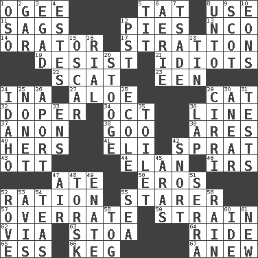 ACROSS 1. Double curve, resembling the letter S 5. Make lace 8. Purpose 11. Droops 12. Sliced desserts 13. Non-commissioned officer (abbr.) 14. Speaker 17. Ski resort town in Vermont 19. Cease 21. Foolish or stupid persons 22. Get outta here! 23. Car or cant ending 24. _ tizzy (2 wds.) 27. Medicinal plant 29. Domesticated feline 32. Drug addict 34. Sep. follower 36. Actor's bit 37. Soon (poet.) 38. Thick or sticky substance 39. Ancient Greek god of war 40. Possessive pronoun 41. Connecticut Ivy Leaguer 42. Small fatty European fish 43. Baseball player Mel 44. Flair 46. Big collection agency 47. Had dinner 50. Greek god of love 52. Food allowance for one day 55. A viewer who gazes fixedly 57. Make much ado about nothing 59. Put through a sieve 62. By way of 63. Portico 64. Travel on or in a vehicle 65. Double-curved letter 66. Barrel 67. Afresh DOWN 1. Bear (Spanish) 2. Slender fish 3. Mild oath 4. _____ Park, CO 5. Teat (slang) 6. Nest on high 7. Sadhe (variant) 8. To (old English) 9. Native of Scotland 10. Immeasurably long periods of time 12. Pacific Standard Time (abbr.) 15. Motion picture award 16. Monetary unit of Yemen 18. Metal container 20. Moe Howard, for one 24. Potato state 25. Music written for nine 26. To the left, to Queeg 28. Learning spot: Fr. 29. High-altitude cloud 30. Approach 31. Trials 33. Followers of ems 35. Bathroom 36. Infant locale 42. Derisive sound 45. Ancient river in northeast Turkey 47. Atmosphere 48. Cod relative 49. Related on the mother's side 51. Father Junipero _ 52. Be footloose 53. Opinion 54. Afternoon social gatherings 55. Ocean 56. Water falling in drops from the sky 58. Coat; cloak 60. Binary compound 61. ___ Haven, CT