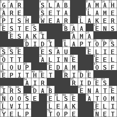 ACROSS 1. Slender fish 4. Thick slice 8. Housemaid 12. "We ___ not amused" (Victoria) 13. Stalk of a moss capsule 14. Unable to walk 15. Expression of disdain 17. Erode 18. Member of a famous L.A. basketball team 19. _____ Park, CO 21. Sound made by sheep 23. Followers of ems 24. 1973 Nobel Price Winner (Physics) Leo 26. Nursemaid (var.) 28. "You Light Up My Life" star Conn 30. Portable computers 34. Compass dir. 37. He sold his birthright 39. Writer Wiesel 40. Baseball player Mel 41. Place in a line 43. Snakelike fish 44. Central Nebraska county 46. Dutch treat 47. Order of Saint Francis (abbr.) 48. Curse 51. Travel on an animal 54. Atmosphere 55. Amusement-park features 58. Big collection agency 61. Small moist lump or mass 63. Maternal 65. Trap for birds or small mammals 67. Otherwise 71. Tiny particle 72. 57 in ancient Rome 73. Path through which fluid escapes 74. Biblical high priest 75. Sharp bark 76. Drink excessively 77. Fish or hair follower DOWN 1. Stare wonderingly 2. Get up 3. Musical pauses 4. Compass dir. 5. Area sheltered from the wind 6. "One Day ___ Time" 7. Sharp remark 8. Chicken ___ king 9. Create 10. So be it 11. Possessive pronoun 16. Froth on beer 18. Desk light 20. What Jean-Claude Killy likes to do 22. American Automobile Association (abbr.) 25. It may be bright or harebrained 27. Had dinner 29. Small island 30. Type of eclipse 31. Butter sub 32. Sliced desserts 33. Automatically 34. Not divided or shared with others 35. Obstruct or block passage 36. Needle case 38. Help 42. Arab leader 45. Parent Teacher Association (abbr.) 49. Flintstone garb 50. Epoch 52. Expire 53. Pulitzer Prize-winning author Ferber 56. Ingested 57. Fur scarf 58. In an inward manner 59. Be footloose 60. Land 62. Waist strap 64. Give off 66. Small drink 68. Lion 69. Plant excrement 70. Supplement with great effort