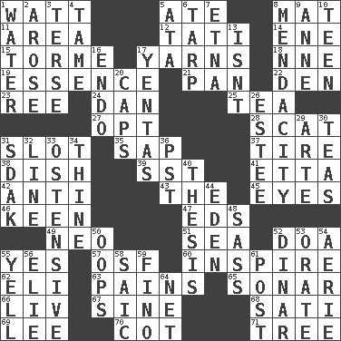 ACROSS 1. Electrical Unit 5. Had dinner 8. Floor covering 11. Type of rug 12. Jacques of French films 14. Compass dir. 15. Singer Mel 17. Entertaining tales 18. Compass dir. 19. Gist 21. Baking dish 22. Lair 23. Portuguese money of account (variant) 24. One of the 12 tribes of Israel 25. Afternoon social gathering 27. Choose 28. Scram! 31. Position in a hierarchy or organization 35. Plant excrement 37. Become fatigued 38. Food container 39. Fast jet (abbr.) 41. Singer James 42. Against 43. Definite Article 45. Sight organs 46. Peachy ____! 47. Begley and Asner 49. Modern: prefix 51. Ocean 52. ___ good deed 55. Consenting reply 57. Order of Saint Francis (abbr.) 60. Stimulate to action 62. Connecticut Ivy Leaguer 63. Aches 65. Underwater navigation system 66. 54 in ancient Rome 67. Trig term 68. Suttee (variant) 69. Area sheltered from the wind 70. Small bed 71. Woody plant DOWN 1. Wetness 2. Came up 3. Laconic 4. Not wild 5. "One Day ___ Time" 6. Canvas cover 7. Inactive volcano in Sicily 8. Ananias' fault 9. Queen of England 1702-14 10. Adolescent 13. Is not 16. Inside; within (prefix) 17. Gossips 20. Balmoral and tarboosh 26. First name in cosmetics 29. Johnson of "Laugh-In" 30. Afternoon social gatherings 31. Neighbor of Neb. 32. Actor's bit 33. Clearly or manifestly demonstrative 34. One or ones belonging to thee 36. Pacific Standard Time (abbr.) 40. College paper 44. Paradise 48. Backtalk 50. I made a mistake 52. Middle Eastern gold or silver currency 53. Speak pompously 54. Nest on high 55. Shout 56. Writer Wiesel 58. Ketch in the Levant 59. Fine (Spanish) 61. Mail 64. Fish or hair follower