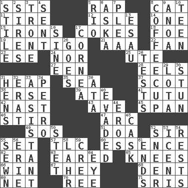 ACROSS 1. Fast planes 5. Hit sharply and swiftly 8. Domesticated feline 11. Hoop that covers a wheel 12. Small island 14. Single 15. Removes the wrinkles 17. Popular sodas 18. Enemy 19. Small, flat, pigmented spot on the skin 21. American Automobile Association (abbr.) 22. Air blower 23. Compass dir. 24. And not 25. Shoshoni 27. Car or cant ending 28. Snakelike fish 31. Pile 35. Ocean 37. Highlander 38. Celtic language 39. Had dinner 41. Ballerina skirt 42. Political cartoonist Thomas 43. "___ Maria" 45. Connect, as a bridge 46. Disorderly outburst 47. Curve 49. Mayday 51. ___ good deed 52. Title for a knight 55. Put into a specified state 57. Affectionate concern, for short 60. Gist 62. Epoch 63. Having ears or earlike features 65. Leg joints 66. Acquire through effort 67. Those things 68. Scratch 69. Fish or hair follower 70. Portuguese money of account (variant) 71. Indian titles of respect DOWN 1. Vertical member of a panel or frame 2. Titles for men of rank and authority 3. Marketplace scale 4. Emitted 5. _ de Janeiro 6. "____ silly question..." 7. Entreaty 8. Java holder (2 wds.) 9. Small Philippine buffalo 10. Adolescent 13. He sold his birthright 16. Trig term 17. Pupil covering 20. Moves 26. Trials 29. Globular water bottle used in Asia 30. Make senseless or dizzy 31. Coop moms 32. Part of Q.E.F. 33. Helper 34. Stone: prefix 36. _ moment's notice (2 wds.) 40. Eluded 44. Greek god of love 48. Keg 50. Proofreading order 52. Scornful expression 53. Ancient Celtic tribe of eastern Britain 54. Musical pauses 55. Stitched 56. One of the Great Lakes 58. Cowardly lion portrayer 59. Algonquian 61. Conclusions 64. Sight organ