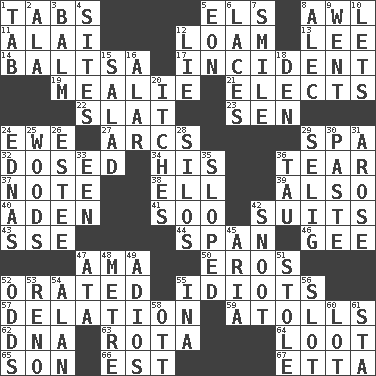 ACROSS 1. Bar bills 5. Raised railways 8. Leather borer 11. Jai ____ 12. Rich soil 13. Area sheltered from the wind 14. Greek mezzo-soprano Agnes 17. Event 19. Ear of corn 21. Chooses 22. Narrow board 23. Elected rep. 24. She-sheep 27. Curves 29. Health resort 32. Administered medicine 34. Part of HMS, perhaps 36. Lacerate 37. Short letter 38. Pipe bend 39. In addition 40. An important port of Yemen 41. "Barney Miller" actor Jack 42. Costumes for special activities 43. Compass dir. 44. Connect, as a bridge 46. Unit of force equal to gravity 47. Nursemaid (var.) 50. Greek god of love 52. Declaimed 55. Foolish or stupid persons 57. Accusation by an informer 59. Ringlike coral islands and reefs 62. Heredity factor (abbr.) 63. Round or rotation of duties 64. Spoils 65. Male child 66. Eastern Standard Time (abbr.) 67. Singer James DOWN 1. Keyboard key 2. Chicken ___ king 3. Lip ointment 4. Locates 5. A really long time 6. Shoestrings 7. Grin 8. Actor Baldwin 9. Gone 10. Allows 12. Whopper 15. Vegetable dish 16. Having or resembling wings 18. Lair 20. Skin irritations 24. Ferber et al. 25. Forest 26. First name in cosmetics 28. Grain storage towers 29. Former Milwaukee Brewers owner Bud 30. Thick mixture 31. Came up 33. Car or cant ending 35. Inclined 36. The 19th letter of the Greek alphabet 42. Snob 45. Roberta Peters solo 47. _ moment's notice (2 wds.) 48. Distance measurement (Brit.) 49. Goodbye (Sp.) 51. Took without asking 52. Likelihood 53. Western Nevada city 54. Actor Alda or Thicke 55. _ tizzy (2 wds.) 56. Position in a hierarchy or organization 58. Baseball player Mel 60. Car dealer's back yard 61. R.R. building