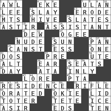 ACROSS 1. Leather borer 4. Make supply last 7. Uhlan (variant) 11. Area sheltered from the wind 12. Kill 13. Eat (away) 14. Mountains (abbr.) 15. Hub of activity 16. Chalkboards 17. Moving about 19. Aide 21. Morning condensation 23. Double curve, resembling the letter S 24. Unadorned 25. Player for Phoenix 26. Baking dish 29. 2nd pers. sing. pres. of can (arch.) 30. Double-curved letter 31. Single 32. Two (Sp.) 33. Before (prefix) 34. Shoshoni 35. Keyboard modifier key 36. Ewer handle 37. Theater features 40. 24 hours 41. _ moment's notice (2 wds.) 42. Inwardly 43. Old wives' tales, e.g. 45. Parent Teacher Association (abbr.) 46. Home 51. Ransack; plunder; pillage 55. Spoke pompously 56. Migrant worker of the '30s 58. Flaplike covering 59. Carrier 60. False hair 61. Frozen water 62. SW Saudi Arabia district 63. Begley and Asner 64. Nine, plus one DOWN 1. _ mater 2. Moistens 3. For fear that 4. Connecticut Ivy Leaguer 5. Polynesian shrub of the pepper family 6. Snake ____ (dice throw) 7. A salt of uric acid 8. Globular water bottle used in Asia 9. An important port of Yemen 10. A home for chicks 12. Fragments 13. Otherwise 16. Signals 18. Goddess of spring and wife of Bragi 20. Boozer 22. Soggy 24. Difficult 25. Father Junipero _ 26. Marked by pouting 27. Pismires 28. Born 29. Root beer relative 32. June honoree 33. Eucharist need 36. Having ears or earlike features 37. Small drink 38. Main course 39. Mountain range southwest of Kyrgyzstan 43. 61 cubic inches 44. River in Europe 46. Round or rotation of duties 47. Greek god of love 48. Suttee (variant) 49. ____ d'Azur (French Riviera) 50. Made supply last 52. Sudden quick movement 53. Louse (plural) 54. Locale of original sin 57. ___ a Wonderful Life