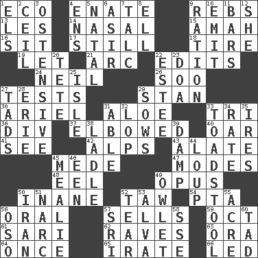 ACROSS 1. Environmental prefix 4. Maternal 9. Confederate soldiers (slang) 13. French article 14. Relating to the nose 15. Wet nurse 16. Be seated 17. Free of sound 18. Become fatigued 19. Allow 21. Curve 22. Proofreads 24. Famous astronaut Armstrong 26. "Barney Miller" actor Jack 27. Trials 29. Comedian Laurel of Laurel & Hardy 30. Satellite of Uranus 31. Medicinal plant 33. Three (prefix) 36. HTML Container Element 37. Turned at an angle; bent 40. Boat paddle 41. Perceive with the eye 42. High mountains 43. Having winglike extensions 45. Ancient Persian 47. Methods 48. Snakelike fish 49. Musical composition 50. Empty; void 52. The 23rd letter of the Hebrew alphabet 54. Parent Teacher Assoc. 56. Of the mouth 57. Makes a sale 59. Sep. follower 61. Indian skirt 62. All-night dance parties 63. Mouth or opening 64. At one time in the past 65. Feeling or showing extreme anger 66. Directed DOWN 1. Raised railways 2. To provide with a ceiling 3. Clearly or manifestly demonstrative 4. Followers of ems 5. Brizilian seaport 6. SW Saudi Arabia district 7. Baby powder 8. Pipe bend 9. Food allowance for one day 10. Send forth 11. Oblong pieces of solid material 12. A female animal or person 20. False hair 22. First name in cosmetics 23. ___ good deed 25. Capri or Wright 27. Small amounts or degrees 28. One of the Great Lakes 29. Sty mamas 31. Competent 32. Chop off 33. Inedible or poisonous agaric 34. Pace 35. Angers 38. Dipping utensil 39. Moist 44. Central Nebraska county 45. Ear of corn 46. Car or cant ending 49. A small or young owl 50. SW Asia republic 51. Drug cop 52. Pull apart 53. Inventor's middle name 55. Land measure 56. Bear (Spanish) 57. Indian title of respect (Mr.) 58. Compass dir. 60. Bit