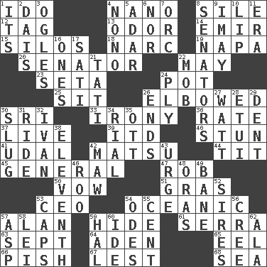 ACROSS 1. Wedding promise 4. Billionth: prefix 8. Filth; sediment 12. Label 13. Scent 14. Independent ruler or chieftain 15. Grain storage towers 18. Drug cop 19. California wine valley 20. Elected representative 22. Can I? 23. Stalk of a moss capsule 24. Cooking vessel 25. Be seated 26. Turned at an angle; bent 30. _ Lanka 33. Literary sarcasm 36. Assign a rank or rating to 37. Not recorded 39. It would 40. Surprise greatly 41. Hereditary estate 42. Taiwanese island in East China Sea 44. Teat (slang) 45. Commissioned military rank 47. Director Reiner 50. Promise 51. Pate de foie ____ 53. Corporate head (abbr.) 54. Pertaining to the sea 57. ____ Jay Lerner 59. Flintstone garb 61. Spanish missionary in California 63. Back-to-school mo. 64. An important port of Yemen 65. Snakelike fish 66. Expression of disdain 67. For fear that 68. Ocean DOWN 1. ___ a Wonderful Life 2. Raised platform 3. Stares at amorously 4. Words to Nanette 5. The sixth month of the Jewish calendar 6. And not 7. The grampus (Milton) 8. Legislators 9. "If ____ say so..." 10. Mouth edge 11. Period 16. Singles 17. Suttee (variant) 21. Jacques of French films 22. Crowd into 24. Travel a route regularly 26. Conclusions 27. Electrical Unit 28. Needle holder 29. Scratch 30. Strike heavily 31. Travel on an animal 32. "Terrible" tsar 34. Monetary unit of Yemen 35. Baseball player Mel 38. Veterans Day date 42. Informal term for the mouth 43. Goad 46. Friend of Pooh 48. Mouths or openings 49. Object of repulsion 52. Male parents of animals 53. Smile enhancers 54. Lyric poems 55. Penny 56. Algonquian 57. Viper 58. Luau accessory 59. Actor Linden 60. Binary compound 62. Insect wing