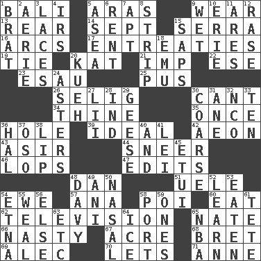ACROSS 1. Indonesian resort city 5. Ancient river in northeast Turkey 9. Erode 13. Tail end 14. Back-to-school mo. 15. Father Junipero _ 16. Curves 17. Pleas 19. Neckwear 20. Krazy ___ of comics 21. Mischievous child 22. Compass dir. 23. He sold his birthright 25. Purulenc 26. Major League Baseball Commissioner Bud 30. Patter 34. One or ones belonging to thee 35. At one time in the past 36. Opening into or through something 39. Perfect 42. A really long time 43. SW Saudi Arabia district 44. Contemptuous expression 46. Chops off 47. Proofreads 48. Daniel's nick name 51. Ubangi River tributary 54. She-sheep 57. Santa ___, CA 58. Luau course 60. Consume 62. Household entertainment appliance 65. Nathan's nickname 66. Difficult 67. 43,560 square feet 68. Cy Young winner Saberhagen 69. Actor Baldwin 70. Allows 71. Queen of England 1702-14 DOWN 1. Naughty child 2. Nest on high 3. Shoestrings 4. Big collection agency 5. Toward the sea 6. Monthly bill 7. Fitting 8. Remove all contents or possession from 9. Dripping 10. 4th largest of the Great Lakes 11. Ancient Greek god of war 12. Raze (variant) 15. Plant excrements 18. Australian flightless bird 20. Malaysian steamed pastry 24. Michaelmas daisies 27. Cards in a Roman deck? 28. Indiana (abbr.) 29. Honkers 30. Rough 31. A saturated hydrocarbon 32. Non-commissioned officer (abbr.) 33. "___ Little Indians" 36. Actor Linden 37. Bear (Spanish) 38. Mouth edge 40. Plus 41. Luau accessory 45. Needle holder 48. _ Jones' Locker 49. Black tropical American cuckoo 50. Rhinal 52. Acquire or gain knowledge or skills 53. Ingested 54. Inactive volcano in Sicily 55. Welt 56. Otherwise 58. Left side of a ship or aircraft 59. Singles 61. False hair 63. And so on (abbr.) 64. Frozen water 65. Basketball assoc.
