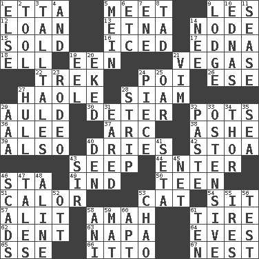 ACROSS 1. Singer James 5. Confront 9. French article 12. Grant temporary use of 13. Inactive volcano in Sicily 14. Connecting point 15. Exchanged or delivered for money 16. On the rocks 17. Pulitzer Prize-winning author Ferber 18. Pipe bend 19. Car or cant ending 21. Viva Las _ 22. Long journey 24. Luau course 26. Compass dir. 27. White Person, in Hawaii 28. Thailand, formerly 29. Old (Scot.) 30. Prevent from occurring 32. Plant holders 36. Toward shelter 37. Curve 38. American tennis player Robert 39. In addition 40. Frees from moisture 42. Portico 43. Ooze 44. Keyboard key 46. R.R. building 49. Working for oneself (abbr.) 50. Adolescent 51. Bodily heat indicating an inflammation 53. Feline 54. Be seated 57. Came down and settled, as after flight 58. Housemaid 61. Hoop that covers a wheel 62. Gouge 63. California wine valley 64. Nights before holidays 65. Compass dir. 66. "Tell ____ the Marines!" 67. Egg locale DOWN 1. Otherwise 2. Instrument 3. Baron Munchausen's specialties 4. Added to 5. Chow _ 6. And so on (abbr.) 7. Compass dir. 8. Bit 9. Inn 10. Ferber et al. 11. Gospel singer Marvin 14. Born 19. Snakelike fish 20. Supplemented with great effort 21. Zeal 23. Cowboy competition 24. Component 25. Rowing implement 27. Frame or body of a ship 28. Long narrow piece of something 29. American Automobile Association (abbr.) 31. Having ears or earlike features 32. Thick mixture 33. Clearly or manifestly demonstrative 34. Son of Odin 35. Ocean 40. Lair 41. Stalk of a moss capsule 43. Title for a knight 45. Fish or hair follower 46. Heaps 47. Lies 48. Place in a line 52. Baseball player Mel 53. US Secretary of Labor Elaine L. _ 55. Angers 56. Trial 58. Black tropical American cuckoo 59. Floor covering 60. Fitting 61. "___ Little Indians"