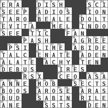 ACROSS 1. Period 4. Food container 8. _-fi 11. Ooze 13. Goodbye (Sp.) 15. Electrically charged atom 16. Pacific island yam 17. Memphis, Tenn. Street 18. Stupid person 19. Webber/Rice musical 21. Cartoonist voice _ Blanc 22. _ china 23. Observe 24. Nervous spasm 27. Avid follower 29. Romantic infatuation 30. Match 34. 23rd letter of the Greek alphabet 36. Welles in "The Third Man" 39. Tolerate 40. Baby powder 41. Related on the mother's side 43. Arabian gulf 44. Having winglike extensions 46. Painful 47. "___ Little Indians" 48. Alight from a bus 49. Angers 51. Acura sports coupe 53. Corporate head (abbr.) 54. White ___ sheet 57. Singer Murray 60. Disorderly crowd 63. Religious groups 65. Expressions of contempt or scorn 66. Came up 69. Ancient river in northeast Turkey 70. Partially opened flower 71. Unit of acoustic absorption 72. Cause heat under the collar 73. A saturated hydrocarbon 74. Fast planes 75. Lair DOWN 1. _____ Park, CO 2. Rob, plunder, or pillage 3. Nest on high 4. Small moist lump or mass 5. Binary compound 6. Thailand, formerly 7. Opening into or through something 8. The Jewish people; Israel 9. Having a low temperature 10. To the inside or interior of 12. Plant holder 14. Itself 18. Empty-headed or silly people 20. _ moment's notice (2 wds.) 25. Small island 26. Large country 28. Auto club (abbr.) 29. Photos 31. Travel on an animal 32. Locale of original sin 33. Car or cant ending 34. Diluted with white 35. Thick slice 37. Big _ 38. Principle of right and wrong 40. Small amount or degree 42. Jane of fiction 45. Double-curved letter 50. Greek goddess of the dawn 52. Dec. holiday 54. Bitter 55. Showing deterioration from age 56. NE Netherlands city 57. Swedish rock group 58. Part of speech 59. Thickened enlargement 61. Mouths or openings 62. Moves up and down 64. Hearing organ 67. Be seated 68. Followers of ems