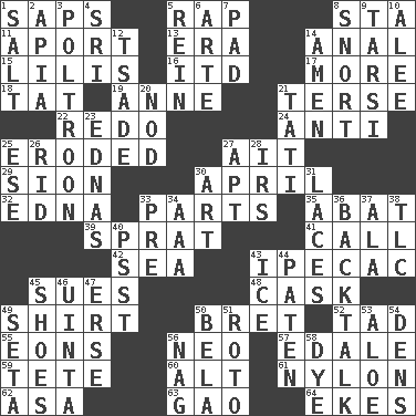 ACROSS 1. Plant excrements 5. Reproach for some lapse or misdeed 8. R.R. building 11. To the left, to Queeg 13. Period 14. Of or related to the anus 15. Ms. Damita and namesakes 16. It would 17. Greater amount 18. Make lace 19. Queen of England 1702-14 21. Laconic 22. Redecorate 24. Against 25. Eaten away 27. Small island 29. The Jewish people; Israel 30. Showery time 32. Pulitzer Prize-winning author Ferber 33. Components 35. Blind as ____ 39. Small fatty European fish 41. Give a ring to 42. Ocean 43. Medicinal drug used to evoke vomiting 45. Institutes legal proceedings 48. Keg 49. Upper-body garment 50. Cy Young winner Saberhagen 52. Small amount or degree 55. Immeasurably long periods of time 56. Modern: prefix 57. Peak District village in England 59. False hair 60. The first octave above the treble staff 61. High-strength synthetic material 62. White ___ sheet 63. E Mali city 64. Supplements with great effort DOWN 1. Table seasoning 2. Capital of Western Samoa 3. Characterized by complete cowardliness 4. Indian title of respect (Mr.) 5. It's straight from the horse's mouth 6. Johnson of "Laugh-In" 7. Groovy apt. 8. Derisive sound 9. Tarsus (plural) 10. Toward shelter 12. Sadhe (variant) 14. So be it 20. Lower and raise head in agreement 21. Jacques of French films 23. Ferber et al. 25. Compass dir. 26. To free from 27. Fitting 28. Big collection agency 30. Nonscientific branch of learning 31. Shoestrings 33. Before (prefix) 34. American Automobile Association (abbr.) 36. Sass 37. According to 38. Affectionate concern, for short 40. Inconspicuous attention getter 43. Frozen water 44. Eucharist need 45. Imelda's hoard 46. National forest in Provo, Utah 47. Celtic language 49. Stalk of a moss capsule 50. Actor Lugosi 51. Printing process, for short 53. _ vera 54. Habitations of wild animals 56. Tired old horse 58. Color
