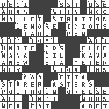 ACROSS 1. Tenth: prefix 5. Fast jet (abbr.) 8. Purpose 11. Ancient river in northeast Turkey 12. Arranges properly for use 13. Non-commissioned officer (abbr.) 14. Place for singles 17. Ski resort town in Vermont 19. Poe poem 21. Foolish or stupid persons 22. Edible starchy tuberous root 23. Fenced enclosure 24. Mouth edge 27. Heavy book 29. Keyboard modifier key 32. Join together 34. Begley and Asner 36. Writer Wiesel 37. Grandmother 38. Lubricate 39. Polynesian shrub of the pepper family 40. Afresh 41. R.R. building 42. Distance measurement 43. Marina Del _, California 44. Portico 46. Followers of ems 47. American Automobile Association (abbr.) 50. Singer James 52. A viewer who gazes fixedly 55. Michaelmas daisies 57. Coward 59. Threatening words 62. Everything 63. Body of Kaffir warriors 64. Good sense 65. Teachers' org. 66. Consume 67. Collude with DOWN 1. Simpleton 2. Epoch 3. Give a ring to 4. Small island 5. Arrange properly for use 6. Long narrow piece of something 7. Sadhe (variant) 8. To (old English) 9. Native of Scotland 10. Immeasurably long periods of time 12. Compass dir. 15. Maternal 16. "Corrida" creature 18. Shallow baking pan 20. Lover boys 24. Type of eclipse 25. Lacking in sense or substance 26. Abounding in pines 28. Proofreads 29. Having winglike extensions 30. Make or become more lively 31. Lacerates 33. The 23rd letter of the Hebrew alphabet 35. Chalkboards 36. Make supply last 42. Mother 45. "Beetle Bailey" pooch 47. Nonscientific branch of learning 48. Nest on high 49. Scent 51. Sports stadium 52. Connect, as a bridge 53. Lacquered or enameled metalware 54. Silent film actress Nazimova 55. Cuckoo 56. Oscar Madison type 58. Elect 60. Take to court 61. Eastern Standard Time (abbr.)