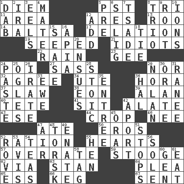 ACROSS 1. South Vietnam president (1954) 5. Pacific Standard Time (abbr.) 8. Three (prefix) 11. Type of rug 12. Ancient Greek god of war 13. Friend of Pooh 14. Greek mezzo-soprano Agnes 17. Conveyance 19. Oozed 21. Foolish or stupid persons 22. Water falling in drops from the sky 23. Unit of force equal to gravity 24. Luau course 27. Backtalk 29. Or not 32. Match 34. Shoshoni 36. Israeli folk dance 37. Cole _ (cabbage dish) 38. Age 39. ____ Jay Lerner 40. Wig 41. Be seated 42. Having winglike extensions 43. Compass dir. 44. Riding implement 46. Born 47. Had dinner 50. Greek god of love 52. Food allowance for one day 55. Centers 57. Make much ado about nothing 59. Moe Howard, for one 62. By way of 63. Comedian Laurel of Laurel & Hardy 64. Entreaty 65. Curvy letter 66. Barrel 67. Transmitted DOWN 1. Small moist lump or mass 2. Lyricist Gershwin 3. Snakelike fish 4. Mother 5. Before (prefix) 6. Major League Baseball Commissioner Bud 7. Sadhe (variant) 8. Musical group of three 9. Carrot, for example 10. Charged particles 12. Find the sum of 15. Gospel singer Marvin 16. Capital of Western Samoa 18. Standoff 20. Takes place subsequently 24. Thick mixture 25. Stares at amorously 26. Feeling or showing extreme anger 28. Unemotional 29. Pitcher Ryan 30. Declaim 31. Indian princess (variant) 33. She-sheep 35. Main course 36. Actor Linden 42. To the left, to Queeg 45. Mouths or openings 47. Atmosphere 48. Cod relative 49. Maternal 51. Obstructs or blocks passage 52. Be footloose 53. Opinion 54. Afternoon social gatherings 55. Layer 56. Not divided or shared with others 58. Label 60. Commissioned mil. rank 61. Consume