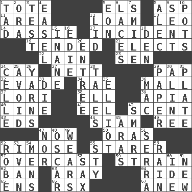 ACROSS 1. Carryall 5. Raised railways 8. Viper 11. Length times width 12. Rich soil 13. Lion 14. Hyrax 17. Happening 19. Watched over 21. Chooses 22. (Had) reclined 23. Elected rep. 24. Island 27. Remaining after all deductions 29. Infant food 32. Elude 34. Actress Charlotte 36. Shopping center 37. Australian parrot (variant) 38. Pipe bend 39. Capital of Western Samoa 40. Actor's bit 41. Snakelike fish 42. Aroma 43. Begley and Asner 44. Thailand, formerly 46. To riddle 47. Immediately 50. Mouths or openings 52. Full of chinks, cracks, or crevices 55. A viewer who gazes fixedly 57. Cloudy 59. Put through a sieve 62. Bar 63. Like ___ of sunshine 64. Travel on an animal 65. Followers of ems 66. Acura sports coupe 67. Afresh DOWN 1. Small amount or degree 2. Mouth or opening 3. Trial 4. Artist's stand 5. Period of immesurable duration 6. Shoestrings 7. Grin 8. Actor Baldwin 9. Emitted 10. Cooking vessels 12. Flaplike covering 15. Empty; void 16. Singer Brickell 18. Lair 20. Main course 24. Cell (Danish) 25. Stay clear from 26. Entertaining tales 28. Stories 29. Some stationery 30. Place in a line 31. Food holder 33. Pass on 35. American author Paul (1891-1958) 36. Big _ 42. Don Adams' spy role 45. Caspian sea tributary 47. Not either 48. Motion picture award 49. Erodes 51. Spanish missionary in California 52. Loose flowing garment 53. "Terrible" tsar 54. Not women's 55. Filthy place 56. Precipitation 58. Saxophone 60. Binary compound 61. ___ Haven, CT