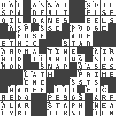 ACROSS 1. Clumsy lout 4. Slender Brazilian palm 9. Earth 13. Health resort 14. Started a card game 15. Otherwise 16. Lubricate 17. Natives or inhabitants of Denmark 18. Snakelike fish 19. Cleo's killer 21. Compass dir. 22. Porridge 24. Celtic language 26. "We ___ not amused" (Victoria) 27. Moral principle 29. Play the lead 30. Odor 31. Prong on a fork 33. Wind 36. _ de Janeiro 37. Lacerating 40. R.R. building 41. Lower and raise head in agreement 42. Fastener 43. Fertile tracts in a desert 45. Thin strip of wood or metal 47. First class 48. Compass dir. 49. Fast planes 50. The wife of a rajah (variant) 52. Teat (slang) 54. And so on (abbr.) 56. Make new 57. Mexican monetary units 59. Sandy's bark 61. Having or resembling wings 62. Staphylococcus 63. Teachers' org. 64. Jane of fiction 65. Laconic 66. Nine, plus one DOWN 1. Bear (Spanish) 2. Capital of Western Samoa 3. It jiggles the polygraph 4. Say or write further 5. Gospel singer Marvin 6. Without 7. Toward shelter 8. ___ a Wonderful Life 9. Sowing specialist 10. Cassini of fashion 11. Small island 12. French article 20. Demure 22. Eucharist need 23. Mouth or opening 25. Jazz singing style 27. Merit 28. Musical group of three 29. Clip 31. Hyperbolic tangent 32. Retirement account (abbr.) 33. Helper 34. Detail 35. Raze (variant) 38. First name in cosmetics 39. Republicans 44. Johnson of "Laugh-In" 45. Poe poem 46. One (Scot) 49. Obstructs or blocks passage 50. Have trust in 51. The sixth month of the Jewish calendar 52. Wig 53. Austrian river, tributary to the Danube 55. Algonquian 56. Actress Charlotte 57. Pacific Standard Time (abbr.) 58. A female animal or person 60. Air blower