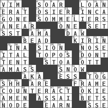 ACROSS 1. Zeal 4. Fly high 8. Grant temporary use of 12. Part of Q.E.F. 14. Flexible twig of a willow tree 16. South American Indian 17. Went 18. Wine waiters 20. Approach 22. Single 23. Arrange properly for use 24. Fast jet (abbr.) 25. Housemaid (var.) 28. Fool 30. Necklace unit 31. Japanese brewing company 35. _ tizzy (2 wds.) 37. The Jewish people; Israel 40. Olfactory organ 41. Slanted text style (abbr.) 42. Traditional theme or motif 44. Do not 45. Portable shelter 46. Portico 47. Baseball player Mel 48. Collect or gather 50. Overwhelm 52. Alias (abbr.) 54. Curvy letter 55. Coat; cloak 58. Quiet! 61. "We ___ not amused" (Victoria) 63. Movie unit 65. Neutralize 70. Migrant worker of the '30s 71. So be it 72. Slender Brazilian palm 73. Stakes 74. Connecting point 75. Merit 76. Compass dir. DOWN 1. Viva Las _ 2. Metal shackles 3. French painter Edouard 4. Mayday 5. Bear (Spanish) 6. Direct toward a target or goal 7. San ____ (Riviera town) 8. Cards in a Roman deck? 9. Washington bills 10. Measure of real estate 11. Political cartoonist Thomas 13. Beverage made from leaves 15. Tear apart 19. Path through which fluid escapes 21. Actress Charlotte 26. Vertical spar for supporting sails 27. Goodbye (Sp.) 29. Light entry point 30. Greek mezzo-soprano Agnes 32. Carrot, for example 33. Is not 34. Fish or hair follower 35. A whole individual unit 36. Nanny 38. Choose 39. Trap for birds or small mammals 41. Call ___ day 43. Without 49. Three-handed card game 51. Order of Saint Francis (abbr.) 53. Length times width 55. Receives possession of 56. Leaves out 57. Honkers 58. Examine hastily 59. Like (prefix) 60. Became colored 62. Celtic language 64. Director Reiner 66. Compass dir. 67. White ___ sheet 68. Auto 69. Shallow baking pan
