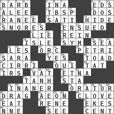 ACROSS 1. Sharp remark 5. _ tizzy (2 wds.) 8. Begley and Asner 11. Toward shelter 12. Cook's measure (abbr.) 14. Two (Sp.) 15. The wife of a rajah (variant) 17. Suttee (variant) 18. Flintstone garb 19. Sounds asleep 21. Took place subsequently 23. Falsehood 25. It's straight from the horse's mouth 26. Capri or Wright 27. Symbol (abbr.) 28. Ocean 31. French article 33. The grampus (Milton) 35. _ dish (used to culture cells) 37. "Two Mules for Sister ____" 38. It is so 40. Frog relative 41. High-altitude cloud 43. Fr. "Yes" 45. Make lace 46. Big collection agency 47. Large container 50. Inactive volcano in Sicily 52. Hyperbolic tangent 53. R.R. building 54. More empty; more void 56. Speaker 61. To be drawn or hauled along 62. Period of immesurable duration 65. Garlic unit 66. Ingest 67. French philosopher Descartes 68. Supplements with great effort 69. Compass dir. 70. Observe 71. Penny DOWN 1. Oblong pieces of solid material 2. ____ Jay Lerner 3. Western Nevada city 4. Fermented drink made from hops 5. It is 6. Basketball assoc. 7. Michaelmas daisies 8. Singer Brickell 9. Texas town _ City 10. Compass dir. 13. Abounding in pines 16. Snakelike fish 18. Attila the _ 20. Grain storage tower 22. Simple or foolish person 24. Suggestive of the supernatural 26. Austrian river, tributary to the Danube 28. Portico 29. Part of Q.E.F. 30. Assist 31. Den 32. Blunders 34. Corporate head (abbr.) 36. Singer James 37. _-fi 39. Takes to court 42. "Terrible" tsar 44. "Tell ____ the Marines!" 48. Approach 49. Threesomes 51. Drug cop 52. Label 54. SW Asia republic 55. Nathan's nickname 57. Actor Baldwin 58. Puff or smoke 59. Baking chamber 60. Respite 61. Lair 63. Single 64. Born