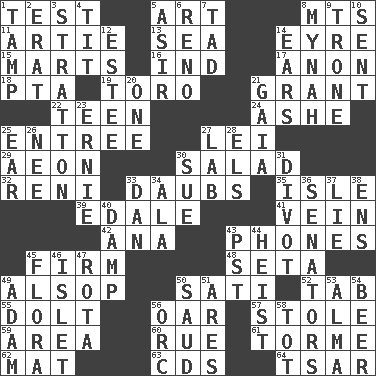 ACROSS 1. Trial 5. Tate display 8. Mountains (abbr.) 11. Nick name for Arthur 13. Ocean 14. Jane of fiction 15. Shops 16. Working for oneself (abbr.) 17. Soon (poet.) 18. Parent Teacher Association (abbr.) 19. "Corrida" creature 21. Let have 22. Adolescent 24. American tennis player Robert 25. Main course 27. Luau accessory 29. Period of immesurable duration 30. First course 32. Painter Guido (1575-1642) 33. Applies to a surface 35. Small island 39. Peak District village in England 41. Distinctive style or manner 42. Santa ___, CA 43. Gives a jingle 45. Become taut 48. Bristle 49. Columnist Joseph or Stewart 50. Suttee (variant) 52. Keyboard key 55. Dunce 56. Boat paddle 57. Fur scarf 59. Type of rug 60. Sorrow 61. Singer Mel 62. Floor protector 63. Music discs 64. Russian ruler of old DOWN 1. Pack (down) 2. Part of Q.E.F. 3. Ski resort town in Vermont 4. Teat (slang) 5. SW Saudi Arabia district 6. Western Nevada city 7. Small amount or degree 8. Non-adult bird? 9. Heavy duty weighing machine 10. Transmitted 12. First name in cosmetics 14. Hearing organs 20. Single 21. Greek goddess of the earth (variant) 23. Bert's buddy 25. Hearing organ 26. Born 27. Experiment locale 28. Raised railways 30. Institute legal proceedings 31. A piece of turf (Scot.) 33. One of the 12 tribes of Israel 34. In the manner of 36. Legislators 37. Untruth 38. Followers of ems 40. Moist 43. Pacific Standard Time (abbr.) 44. Robbery 45. Plants 46. Small island 47. Round or rotation of duties 49. First man 50. Saudi Arabian king (1953-1964) 51. Ancient Greek god of war 53. _ mater 54. Fermented drink made from hops 56. The grampus (Milton) 58. Small child
