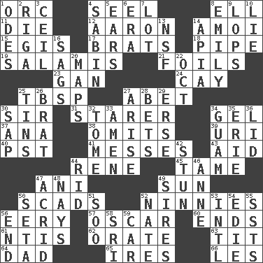 ACROSS 1. The grampus (Milton) 4. Sew up the eyelids of hawks and falcons 8. Pipe bend 11. Expire 12. Composer Copland 14. Mine, in Marseilles 15. Armor plate that protects the chest 17. Naughty children 18. Corncob 19. Deli grouping 21. Fencing necessities 23. Separate the seeds from cotton 24. Island 25. Cook's measure (abbr.) 27. Collude with 30. Title for a knight 31. A viewer who gazes fixedly 34. Set 37. Santa ___, CA 38. Leaves out 39. RI univ. 40. Pacific Standard Time (abbr.) 41. Makes clutter 43. Assist 44. French philosopher Descartes 45. Not wild 47. Black tropical American cuckoo 49. Player for Phoenix 50. Loads 52. Fools 56. Suggestive of the supernatural 57. Witty Wilde 60. Extremities 61. Nuclear Threat Initiatives 62. Speak pompously 63. Teat (slang) 64. June honoree 65. Angers 66. French article DOWN 1. Lyric poems 2. Port city in Latvia 3. To provide with a ceiling 4. Unit of acoustic absorption 5. Hearing organs 6. Period 7. Car dealer's back yard 8. Poet Dickinson 9. Chops off 10. Falsehood 13. Overdraft (abbr.) 14. Capital of Western Samoa 16. Settles 20. Atlas contents 22. Sep. follower 25. Canisters 26. Naughty child 27. Get up 28. Wagers 29. Celtic language 30. Plant excrement 32. Heavy book 33. So be it 34. Island territory of the United States 35. One of the Great Lakes 36. Hat (slang) 42. Make senseless or dizzy 44. To free from 46. Queen of England 1702-14 47. Sour-tasting 48. Negative votes 49. Male parents of animals 50. Bristle 51. "Barney Miller" actor Jack 52. Nathan's nickname 53. International (abbr.) 54. Singer Brickell 55. Fast planes 56. Conclude 58. Indian title of respect (Mr.) 59. Auto