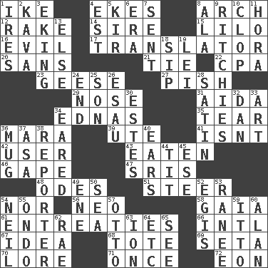 ACROSS 1. Mamie's husband 4. Supplements with great effort 8. Bowlike part 12. Immoral or dissolute person 14. Title for a man of rank and authority 15. _ and Stitch 16. Morally bad or wrong 17. Interpreter 20. Without 21. Neckwear 22. Tax preparer (abbr.) 23. Honkers 27. Expression of disdain 29. Sense of smell 31. Opera by Verdi 34. Ferber et al. 35. Separate forcefully 36. Hindu Mythology: god of death 39. Shoshoni 41. Is not 42. One who makes use of a thing 43. Ingested 46. Yawn 47. Indian titles of respect 48. Lyric poems 51. Navigate 54. Or not 56. Modern: prefix 58. Greek goddess of the earth (variant) 61. Pleas 66. International (abbr.) 67. It may be bright or harebrained 68. Carry 69. Stalk of a moss capsule 70. Old wives' tales, e.g. 71. At one time in the past 72. Period of immesurable duration DOWN 1. Angers 2. Polynesian shrub of the pepper family 3. Supplementing with great effort 4. Eastern Standard Time (abbr.) 5. Apertif with cassis 6. Period 7. Transmitted 8. According to 9. Actors Guy, Robert Welles, and Clint 10. Hoof sound 11. Israeli folk dance 13. Otherwise 18. Small drink 19. Flowery wreath 24. Conclusion 25. Male child 26. He sold his birthright 28. Smooth fabric 30. _____ Park, CO 32. One of the 12 tribes of Israel 33. Tate display 34. Having ears or earlike features 36. Java container 37. White ___ sheet 38. Newsperson 40. Hearing organs 44. Teat (slang) 45. Compass dir. 49. Compass dir. 50. Ocean 52. Armor plate that protects the chest 53. The wife of a rajah (variant) 54. Famous astronaut Armstrong 55. Southwest Nigerian state 57. Von Bismarck 59. "Tell ____ the Marines!" 60. Actor Alda or Thicke 62. Actress Charlotte 63. Electrically charged atom 64. And so on (abbr.) 65. Observe