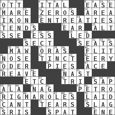 ACROSS 1. Baseball player Mel 4. Slanted text style (abbr.) 8. Relaxation 12. Female horse 14. Nothings 16. Length times width 17. Image 18. Pleas 20. Is inclined (to) 22. Hearing organ 23. The first octave above the treble staff 24. Compass dir. 25. Curvy letter 28. Directed 30. Religious group 31. Theater features 35. Informal term for the mouth 37. Mouths or openings 40. Sudden quick movement 41. Characteristic smell of wine 42. Tinged 44. Suggestive of the supernatural 45. River in Europe 46. Sliced desserts 47. Adept person 48. Rob, plunder, or pillage 50. Political cartoonist Thomas 52. And so on (abbr.) 54. Three (prefix) 55. Plant excrement 58. Insect wing 61. Tired old horse 63. Stone: prefix 65. Frustrating wastes of time 70. Put down 71. Patter 72. Rends 73. Volcanic refuse 74. Indian titles of respect 75. Argument over a trivial matter 76. Compass dir. DOWN 1. Leaves out 2. Receives possession of 3. Heavy duty weighing machine 4. Ending with capital 5. Nine, plus one 6. Tate display 7. Old wives' tales, e.g. 8. Consume 9. Roberta Peters solo 10. Sew up the eyelids of hawks and falcons 11. 90 degrees 13. Conclusion 15. Lick closed 19. Ancient Greek god of war 21. Observe 26. Native of Scotland 27. Remove all contents or possession from 29. Outscore 30. Turn aside suddenly 32. Actor Baldwin 33. Hoop that covers a wheel 34. Filthy place 35. Method 36. Toward the sea 38. Cuckoo 39. Aroma 41. Not either 43. Russian ruler of old 49. Inactive volcano in Sicily 51. Small drink 53. Haul 55. Having lost freshness 56. Believer in; advocate of (suffix) 57. Puddle 58. Curves 59. One who doesn't tell the truth 60. Hindu god of fire 62. Moves 64. Raised railways 66. Mountains (abbr.) 67. Infant locale 68. Period 69. Fast jet (abbr.)