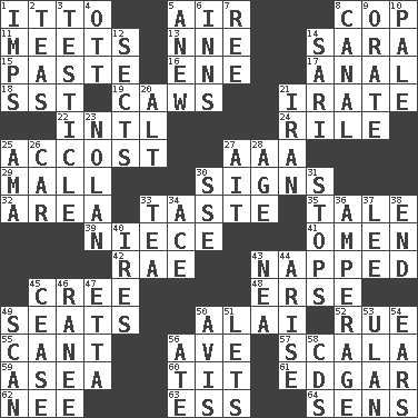ACROSS 1. "Tell ____ the Marines!" 5. Wind 8. Police officer (slang) 11. Confronts 13. Compass dir. 14. "Two Mules for Sister ____" 15. Thick mixture 16. Compass dir. 17. Of or related to the anus 18. Fast jet (abbr.) 19. Crow sounds 21. Feeling or showing extreme anger 22. International (abbr.) 24. Cause heat under the collar 25. Buttonhole 27. Auto club (abbr.) 29. Promenade 30. Public displays of written messages 32. Type of rug 33. Clothes sense 35. Story 39. Sibling's daughter 41. Sign of something about to happen 42. Actress Charlotte 43. Slept 45. Algonquian 48. Celtic language 49. Theater features 50. Jai _ 52. Sorrow 55. Patter 56. "___ Maria" 57. Any of the three canals of the cochlea 59. Toward the sea 60. Teat (slang) 61. _ Allan Poe 62. Born 63. Double-curved letter 64. Elected reps. DOWN 1. Naughty children 2. Beverages made from leaves 3. One of the two male reproductive glands 4. Baseball player Mel 5. Afresh 6. Lodging establishments 7. To riddle 8. Lessep's creation 9. Declaim 10. Light colored 12. Religious groups 14. Indian skirt 20. The first octave above the treble staff 21. SW Asia republic 23. Pitcher Ryan 25. Nursemaid (var.) 26. Automobile 27. Small island 28. Mature 30. Compass dir. 31. Ceases 33. Beverage made from leaves 34. Adept person 36. Electrical Measurement 37. Area sheltered from the wind 38. Conclusion 40. Angers 43. Teachers' org. 44. Originate 45. Stop 46. Indian princess (variant) 47. Singer James 49. Examine minutely or intensely 50. Advice 51. Allows 53. ____ Bator, Mongolia 54. Hearing organs 56. Had dinner 58. Music discs