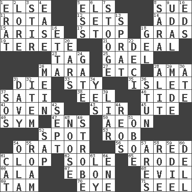 ACROSS 1. Otherwise 5. Raised railways 8. Take to court 11. Roll call or roster of names 12. Puts into a specified state 14. Find the sum of 15. Ascend 17. Close up, plug up 18. Pate de foie ____ 19. Cylindrical with tapered ends 21. Severe or trying experience 23. Label 25. Highlander 26. Hindu Mythology: god of death 27. And so on (abbr.) 28. Housemaid (var.) 31. Expire 33. Filthy place 35. Small island 37. Suttee (variant) 38. Snakelike fish 40. Event that recurs at intervals 41. Baking chambers 43. Title for a knight 45. Shoshoni 46. Symbol (abbr.) 47. Followers of ems 50. A really long time 52. Specific locale 53. Director Reiner 54. Speaker 56. Flew 61. Hoof sound 62. Flatfish 65. Eat (away) 66. In the manner of 67. Inky black, to poets 68. Tending to cause great harm 69. Scottish cap 70. Sight organ 71. Sew up the eyelids of hawks and falcons DOWN 1. Part of Q.E.F. 2. Old wives' tales, e.g. 3. Commotion 4. Comfort 5. Curvy letter 6. Allow 7. Moe Howard, for one 8. "Two Mules for Sister ____" 9. Hereditary estate 10. Begley and Asner 13. Small fatty European fish 16. Singer James 18. Set 20. Hearing organs 22. Tenth: prefix 24. Yard entry 26. Count _ (2 wds.) 28. Set down 29. Ancient Persian 30. Had dinner 31. American folk hero Crockett 32. A whole individual unit 34. Consenting reply 36. Surprise greatly 37. Distress signal 39. One who doesn't tell the truth 42. Back-to-school mo. 44. Vintage cars 48. Trap for birds or small mammals 49. Disco prop 51. Mitch Miller's instrument 52. Plant excrement 54. Rounded earthenware pot or jar 55. Wander aimlessly 57. Ancient Greek god of war 58. Be footloose 59. Singer Brickell 60. Small valley 61. Domesticated feline 63. Myrna of the movies 64. Compass dir.