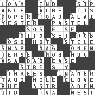 ACROSS 1. Rich soil 5. Conclusion 8. Small drink 11. Competent 12. Measure of real estate 14. It is 15. Drug addict 17. Frog relative 18. Jai _ 19. Of or pertaining to yesterday 21. Soft color 23. Distress signal 25. Otherwise 26. "Beetle Bailey" pooch 27. Put into a specified state 28. Director Reiner 31. Bear (Spanish) 33. Being at a high temperature 35. Vertical member of a panel or frame 37. Fastener 38. Tired old horse 40. Sign of things to come 41. Laconic 43. Crowd into 45. Large cup 46. White ___ sheet 47. June honoree 50. Relaxation 52. Beget 53. Playfully artful 54. Triads 56. Sillier 61. "Change" in Tahitian 62. Mediterranean tributary 65. Garlic unit 66. Regret 67. SW Saudi Arabia district 68. An important port of Yemen 69. It would 70. Federal power corp. 71. Egg locale DOWN 1. Kenny Rogers chart-topper in '80 2. Mitch Miller's instrument 3. High mountains 4. Rendezvous 5. Ingest 6. Non-commissioned officer (abbr.) 7. Window treatments 8. Filth; sediment 9. Slanted text style (abbr.) 10. 23rd letter of the Greek alphabet 13. Peak District village in England 16. Relief 18. Had dinner 20. Writer of Portnoy's Complaint (1969) 22. Fast planes 24. Within a short period 26. I made a mistake 28. Tall New Zealand timber tree 29. Cassini of fashion 30. Benjamin's nick name 31. Singles 32. "Two Mules for Sister ____" 34. Scottish cap 36. Heavy book 37. R.R. building 39. Travels 42. Singer Brickell 44. Indonesian resort city 48. Sports stadium 49. Stop 51. Synchronize (abbr.) 52. _ Lanka 54. Strained 55. Became colored 57. ____ Jay Lerner 58. Connecting point 59. Nights before holidays 60. Monthly bill 61. Three (prefix) 63. 54 in ancient Rome 64. Period