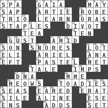 ACROSS 1. Health resort 4. Greek goddess of the earth (variant) 8. Can I? 11. Plant excrement 12. Nick name for Arthur 14. Loose flowing garment 15. Musical group of three 17. Acquire or gain knowledge or skills 18. Mouths or openings 19. Paper fasteners 21. A piece of turf (Scot.) 23. Afternoon social gathering 24. "___ Little Indians" 25. Abrupt rush of wind 27. Among 30. Boy, to dad 31. Sounds asleep 34. Car dealer's back yard 37. Biblical high priest 38. Satellite of Uranus 39. Santa ___, CA 40. Newt 41. Soft color 43. Was introduced to 44. Falsehood 45. Naughty children 47. Heredity factor (abbr.) 49. Madame (abbr.) 50. Catcalls? 52. Sycophants 56. Oceans 57. Having ears or earlike features 60. Part of Q.E.F. 61. Drop; flow; fall 62. Place in a line 63. Compass dir. 64. Followers of ems 65. Sums up 66. Arrange properly for use DOWN 1. Fast planes 2. Role in a play 3. Capital of Western Samoa 4. An organ shaped like a helmet 5. Ancient Greek god of war 6. Call ___ day 7. Atmosphere 8. Person of subnormal intelligence 9. Blind as ____ 10. Consenting reply 13. Conclude 14. Be footloose 16. Chooses 20. Allows 22. It would 25. _ course 26. A single undivided whole 27. Originate 28. Rendezvous 29. Capri or Wright 30. Perceive with the eye 32. California wine valley 33. Of the mouth 34. Desk light 35. Singles 36. Make lace 42. Pale green bean 44. The 23rd letter of the Hebrew alphabet 46. Ancient Persian 47. Allots cards 48. Characteristic smell of wine 49. Methods 50. Count _ (2 wds.) 51. Ocean 52. Look after 53. Angers 54. Comfort 55. Proofreading order 56. Compass dir. 58. Chicken ___ king 59. To free from