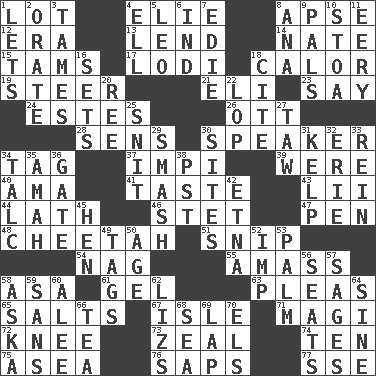ACROSS 1. Car dealer's back yard 4. Writer Wiesel 8. Domed church section 12. Epoch 13. Grant temporary use of 14. Nathan's nickname 15. Scottish caps 17. Farming town in central California 18. Bodily heat indicating an inflammation 19. Bull 21. Connecticut Ivy Leaguer 23. Declare 24. _____ Park, CO 26. Baseball player Mel 28. Elected reps. 30. Orator 34. Label 37. Body of Kaffir warriors 39. We are 40. Wet nurse (var.) 41. Clothes sense 43. Cards in a Roman deck? 44. Thin strip of wood or metal 46. Proofreading order 47. Fenced enclosure 48. Leopard's kin 51. Sever or remove by pinching or nipping 54. Tired old horse 55. Collect or gather 58. White ___ sheet 61. Set 63. Entreaties 65. Table seasonings 67. Small island 71. Wise men 72. Leg joint 73. Ardor 74. "___ Little Indians" 75. At sea 76. Plant excrements 77. Compass dir. DOWN 1. Allows 2. Speak pompously 3. Corrects by punishment or discipline 4. Pipe bend 5. Lion 6. Working for oneself (abbr.) 7. Singer Brickell 8. Santa ___, CA 9. Friends 10. Portico 11. Suggestive of the supernatural 16. Puts into a specified state 18. Quote 20. Portuguese money of account (variant) 22. Trim (branches) 25. In a ____ (agitated or irritated) 27. The 23rd letter of the Hebrew alphabet 29. Box-office sellout 30. Locates 31. Seaweed 32. One of the Great Lakes 33. It's straight from the horse's mouth 34. Baby powder 35. Housemaid 36. Yard entry 38. Pacific Standard Time (abbr.) 42. Inactive volcano in Sicily 45. Layer 49. Labels 50. Grow older 52. Naughty child 53. Inside of hand 56. Theater features 57. Gurus 58. "____ silly question..." 59. Without 60. Toward shelter 62. Belonging to Elizabeth 64. Trig term 66. Beverage made from leaves 68. Ocean 69. Pet locale 70. Raised railways