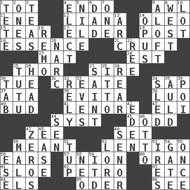 ACROSS 1. Small child 4. Inside; within (prefix) 8. Leather borer 11. Compass dir. 12. Climbing, woody, usually tropical vines 14. Margarine 15. Pull into pieces 17. A person who is older than you are 18. Mail 19. Gist 21. An unpleasant substance 23. Floor covering 24. Eastern Standard Time (abbr.) 25. Son of Odin 27. Father 30. Third day of the wk. 31. Cause to be 34. Plant excrement 37. "One Day ___ Time" 38. Webber/Rice musical 39. Nilotic language 40. Partially opened flower 41. Poe poem 43. Connecticut Ivy Leaguer 44. System (abbr.) 45. Texas town _ City 47. Last letter of the English alphabet 49. Arrange properly for use 50. Intended 52. Small, flat, pigmented spot on the skin 56. Hearing organs 57. The state of being joined or united 60. NW Algerian seaport 61. _ gin 62. Stone: prefix 63. And so on (abbr.) 64. Raised railways 65. River in Europe 66. Observe DOWN 1. Wig 2. Singles 3. Afternoon social gatherings 4. Voters do this 5. The longest river in the world 6. June honoree 7. Single 8. Upward 9. 270 degrees 10. Car dealer's back yard 13. Curve 14. Musical composition 16. San ____ (Riviera town) 20. Drug cop 22. To sift 25. Ballerina skirt 26. Froth on beer 27. Inhabitant of Heaven 28. "Tell ____ the Marines!" 29. Tail end 30. Keyboard key 32. Depend 33. Nights before holidays 34. Downhill vehicle 35. Old (Scot.) 36. Luau course 42. Paradise 44. Elected rep. 46. Von Bismarck 47. Nothings 48. Relaxation 49. Sir (Sp.) 50. Promenade 51. Uncastrated adult male sheep 52. Old wives' tales, e.g. 53. Angers 54. Yard entry 55. Single time 56. Compass dir. 58. Modern: prefix 59. It would
