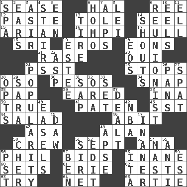 ACROSS 1. Gospel singer Marvin 6. Actor Linden 9. To separate or throw off 12. Thick mixture 13. Lacquered or enameled metalware 14. Sew up the eyelids of hawks and falcons 15. Believer in; advocate of (suffix) 16. Body of Kaffir warriors 17. Frame or body of a ship 18. Indian title of respect (Mr.) 19. Greek god of love 20. Immeasurably long periods of time 21. Raze (variant) 23. Fr. "Yes" 24. Inconspicuous attention getter 25. Discontinues 28. Bear (Spanish) 30. Mexican monetary units 34. Fastener 35. Infant food 36. Having ears or earlike features 38. _ tizzy (2 wds.) 39. Loyal 41. Eucharist need 43. Fast jet (abbr.) 44. Vegetable dish 46. "This won't hurt ____!" 48. White ___ sheet 49. ____ Jay Lerner 50. Ship's personnel 51. Back-to-school mo. 53. Wet nurse (var.) 56. Silvers or Donahue 57. Auction offers 58. Lacking in sense or substance 60. Arranges properly for use 61. One of the Great Lakes 62. Trials 63. Attempt to accomplish something 64. Fish or hair follower 65. Nick name for Arthur DOWN 1. Health resort 2. Hearing organs 3. SW Saudi Arabia district 4. Flight of steps 5. Car or cant ending 6. Same (prefix) 7. High mountains 8. Flowery wreath 9. One who advocates reunion 10. Snakelike fish 11. Pipe bend 13. Hoop that covers a wheel 14. Yells 19. First name in cosmetics 20. Greek goddess of the dawn 22. Cleo's killer 24. Teen's desire 26. Baking dishes 27. Petty quarrel 28. Elects 29. "Two Mules for Sister ____" 31. Plant excrement 32. Mouth or opening 33. Arrange properly for use 37. Started a card game 40. Artist's stands 42. Basketball assoc. 45. Fool 47. More lacking in sense or substance 49. Domed church section 50. "Mermaids" star 51. Beget 52. Prepare for publication 54. Vertical spar for supporting sails 55. Opposed to 56. Pacific Standard Time (abbr.) 57. Benjamin's nick name 58. Call ___ day 59. Compass dir.