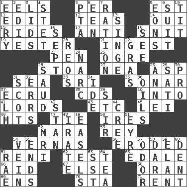ACROSS 1. Snakelike fish 5. For each 8. Eastern Standard Time (abbr.) 11. Prepare for publication 12. Beverages made from leaves 14. Fr. "Yes" 15. Amusement-park features 17. Opposed to 18. In a ____ (agitated or irritated) 19. Of or pertaining to yesterday 21. Consume 23. Writing instrument 25. Legendary monster 26. Portico 27. Teachers' org. 28. Viper 31. Ocean 33. Indian title of respect (Mr.) 35. Underwater navigation system 37. Shade of tan 38. Music discs 40. To the inside or interior of 41. Domineers 43. And so on (abbr.) 45. Luau accessory 46. Mountains (abbr.) 47. Standoff 50. Angers 52. Hindu Mythology: god of death 53. Marina Del _, California 54. Actresses Bloom and Felton 56. Worn away 61. Painter Guido (1575-1642) 62. Trial 65. Peak District village in England 66. Assist 67. Otherwise 68. NW Algerian seaport 69. Followers of ems 70. R.R. building 71. Monthly bill DOWN 1. Suggestive of the supernatural 2. Singer Brickell 3. Hats (slang) 4. Proofreading order 5. Parent Teacher Association (abbr.) 6. Car or cant ending 7. Food allowance for one day 8. Immeasurably long periods of time 9. Set or collection 10. Teat (slang) 13. Burn superficially 16. Back-to-school mo. 18. Perceive with the eye 20. Vintage cars 22. Pate de foie ____ 24. Drug cop 26. Saudi Arabian king (1953-1964) 28. Singer Murray 29. Suttee (variant) 30. Adept person 31. Highlander 32. Blunders 34. Binary compound 36. Lubricates 37. Shade tree 39. Use a spoon 42. Comedian Laurel of Laurel & Hardy 44. Algonquian 48. Feeling or showing extreme anger 49. Artist's stands 51. Jane of fiction 52. Medical imaging device (abbr.) 54. Distinctive style or manner 55. Conclusions 57. Aroma 58. Have the gumption 59. Style 60. Gouge 61. Actress Charlotte 63. Fast jet (abbr.) 64. Afternoon social gathering