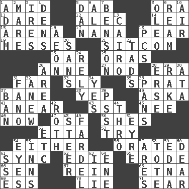 ACROSS 1. Among 5. Apply (a substance) by light strokes 8. Mouth or opening 11. Have the gumption 12. Actor Baldwin 14. Flowery wreath 15. Sports stadium 17. Grandmother 18. Lightbulb-shaped fruit 19. Makes clutter 21. "Cheers" or "Ellen" 23. Boat paddle 25. Mouths or openings 26. Queen of England 1702-14 27. Lower and raise head in agreement 28. Period 31. Distant 33. Secret 35. Small fatty European fish 37. Object of repulsion 38. Slangy assent 40. "____ silly question..." 41. Approach 43. Fast jet (abbr.) 45. Born 46. Immediately 47. Order of Saint Francis (abbr.) 50. "______ My Girl" (Turtles hit) 52. Singer James 53. Attempt to accomplish something 54. One or the other of two 56. Declaimed 61. Synchronize (abbr.) 62. Singer Brickell 65. Wear away 66. Elected rep. 67. It's straight from the horse's mouth 68. Inactive volcano in Sicily 69. Double-curved letter 70. Whopper 71. Scorch DOWN 1. First of billions? 2. Female horse 3. Angers 4. Habitations of wild animals 5. One of the 12 tribes of Israel 6. Insect wing 7. Gillaume's butler role 8. Butter sub 9. 480, 500 or 516 sheets of paper 10. Atmosphere 13. Capital of Egypt 16. Period of immesurable duration 18. Personal Computers (abbr.) 20. Without 22. Small boys 24. Trust 26. Type of rug 28. Celtic language 29. Immoral or dissolute person 30. "One Day ___ Time" 31. Papal veil 32. Afresh 34. Affirmative reply 36. Baking dishes 37. Bar 39. Inconspicuous attention getter 42. Writer of Portnoy's Complaint (1969) 44. Through, poetically 48. Navigate 49. Burden 51. Jane of fiction 52. And so on (abbr.) 54. Sight organs 55. Restaurants 57. Ancient Greek god of war 58. Carry 59. Pulitzer Prize-winning author Ferber 60. Letter starter 61. Compass dir. 63. One more than two 64. Compass dir.
