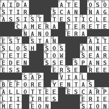 ACROSS 1. Opera by Verdi 5. Had dinner 8. Bear (Spanish) 11. Use a spoon 12. Skim 13. Tired old horse 14. Help 17. A testis 19. Device for capturing images 21. Cylindrical with tapered ends 22. Billionth: prefix 23. Period 24. Eastern Standard Time (abbr.) 27. Comedian Laurel of Laurel & Hardy 29. Small island 32. Splash clumsily 34. Distress signal 36. Singer Murray 37. Wig 38. Pull behind 39. Wither 40. Paradise 41. Compass dir. 42. Connects, as a bridge 43. Curvy letter 44. Celtic language 46. To riddle 47. Plant excrement 50. Small bottle 52. Prior to 55. Gossips 57. One to whom something is allotted 59. Fortification 62. Cards in a Roman deck? 63. Angers 64. One of the Great Lakes 65. Was introduced to 66. Age 67. The Jewish people; Israel DOWN 1. White ___ sheet 2. It is 3. Plate 4. Believer in; advocate of (suffix) 5. Adept person 6. Clothes sense 7. Keyboard key 8. Single time 9. Table seasoning 10. Double curve, resembling the letter S 12. R.R. building 15. Box-office sellout 16. Portable shelter 18. Retirement account (abbr.) 20. Ridicules or criticizes harshly 24. First name in cosmetics 25. Bobsleighs 26. Hauls 28. Trap for birds or small mammals 29. Approach 30. Lacking in sense or substance 31. Laconic 33. Elected rep. 35. Turn aside suddenly 36. Viper 42. Theater features 45. Trig term 47. "Barney Miller" actor Jack 48. Nick name for Arthur 49. Stone: prefix 51. Shoestrings 52. Lip ointment 53. Writer Wiesel 54. Sudden quick movement 55. Consenting reply 56. Indian skirt 58. Car or cant ending 60. River (Sp.) 61. Fenced enclosure