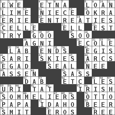 ACROSS 1. She-sheep 4. Inactive volcano in Sicily 8. Grant temporary use of 12. Welles in "The Third Man" 14. Sibling's daughter 16. Gumbo ingredient 17. 4th largest of the Great Lakes 18. Pleas 20. Cell (Danish) 22. Pipe bend 23. Eastern Standard Time (abbr.) 24. Attempt 25. Thick or sticky substance 28. "Barney Miller" actor Jack 30. Hindu god of fire 31. Learning spot: Fr. 35. Experiment locale 37. Conclusions 40. Armor plate that protects the chest 41. Indian skirt 42. Atmospheres 44. Arches 45. Mild oath 46. Lick closed 47. Born 48. NE Netherlands city 50. Backtalk 52. Pat or tap gently 54. And so on (abbr.) 55. French article 58. RI univ. 61. Make lace 63. From or relating to Ireland 65. Wine waiters 70. Von Bismarck 71. Dad 72. Potato state 73. Fermented drink made from hops 74. Stricken, poetically 75. Greek god of love 76. To separate or throw off DOWN 1. Opt 2. One who wires 3. Poet Dickinson 4. Compass dir. 5. Metal container 6. Fish or hair follower 7. Land measure 8. Car dealer's back yard 9. Migrant worker of the '30s 10. Ancient Greek god of war 11. Political cartoonist Thomas 13. Snakelike fish 15. Snakelike fish 19. _ vera 21. Ovum 26. Singles 27. Pig sounds 29. Seas 30. Tolerated 32. Legendary monster 33. Louse (plural) 34. Double-curved letter 35. Straggles 36. Ancient river in northeast Turkey 38. Expire 39. Gospel singer Marvin 41. Ocean 43. Narrow board 49. Nathan's nickname 51. _-fi 53. Indonesian resort city 55. 61 cubic inches 56. First name in cosmetics 57. Dinah or Pauly 58. United States Postal Service (abbr.) 59. Wander aimlessly 60. Body of Kaffir warriors 62. Periodic rise and fall of the sea level 64. Director Reiner 66. Floor protector 67. Ewer handle 68. 17th letter of the Greek alphabet 69. Mayday