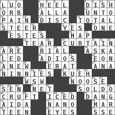 ACROSS 1. Nilotic language 4. Person who is morally reprehensible 8. Food container 12. Globe 13. Silent film actress Nazimova 14. To (old English) 15. Ache 17. Plate 18. Add up to 19. Bull 21. Consenting reply 23. Single 24. _____ Park, CO 26. Atlas unit 28. Rend 30. Window treatment 34. "We ___ not amused" (Victoria) 37. Monetary unit of Yemen 39. "____ silly question..." 40. Directed 41. Goodbye (Sp.) 43. Period of immesurable duration 44. Afresh 46. Part of Q.E.F. 47. Santa ___, CA 48. Simpletons 51. Malaysian steamed pastry 54. Compass dir. 55. Trap for birds or small mammals 58. Elected rep. 61. Fish or hair follower 63. Twentieth part of a lira 65. An unpleasant substance 67. On the rocks 71. Mild oath, euphamism for damn 72. Opera by Verdi 73. Billionth: prefix 74. Make imperfect 75. Adolescent 76. Snake ____ (dice throw) 77. Compass dir. DOWN 1. Chops off 2. A salt of uric acid 3. Off-Broadway awards 4. Possessed 5. Biblical high priest 6. Raised railways 7. Made of lace 8. Superhero pair 9. To the inside or interior of 10. Comedian Laurel of Laurel & Hardy 11. Opening into or through something 16. Remaining after all deductions 18. Russian ruler of old 20. To riddle 22. Australian flightless bird 25. "Two Mules for Sister ____" 27. Parent Teacher Assoc. 29. Amusement-park features 30. Hide under a false appearance 31. Toward the sea 32. Image 33. Nanny 34. Actor Alda or Thicke 35. Painter Guido (1575-1642) 36. Genesis locale 38. Atmosphere 42. Make senseless or dizzy 45. Compass dir. 49. Is not 50. She-sheep 52. Greek goddess of the dawn 53. Parka part 56. Hits or strikes with great force 57. Ferber et al. 58. Jazz singing style 59. One of the Great Lakes 60. Naked 62. Prong on a fork 64. Legendary monster 66. Air blower 68. Island 69. Compass dir. 70. Two (Sp.)