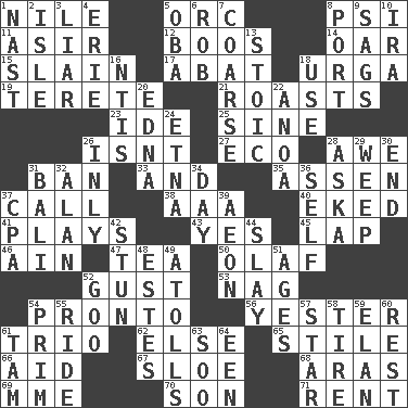 ACROSS 1. "Death on the ____" 5. The grampus (Milton) 8. 23rd letter of the Greek alphabet 11. SW Saudi Arabia district 12. Expressions of contempt or scorn 14. Boat paddle 15. Killed 17. Blind as ____ 18. Capital and largest city of Mongolia 19. Cylindrical with tapered ends 21. Ridicules or criticizes harshly 23. Binary compound 25. Trig term 26. Is not 27. Environmental prefix 28. Deep reverence 31. Bar 33. Also 35. NE Netherlands city 37. Give a ring to 38. Auto club (abbr.) 40. Made supply last 41. Romps 43. Affirmative reply 45. Infant locale 46. The 18th letter of the Arabic alphabet 47. Afternoon social gathering 50. Norwegian king 52. Abrupt rush of wind 53. Tired old horse 54. Right away 56. Of or pertaining to yesterday 61. Musical group of three 62. Otherwise 65. Vertical member of a panel or frame 66. Assist 67. A type of plum 68. Caspian sea tributary 69. Madame (abbr.) 70. Boy, to dad 71. Monthly bill DOWN 1. Political cartoonist Thomas 2. Capri or Wright 3. One who doesn't tell the truth 4. One of the Great Lakes 5. Chief or king in Benin or Nigeria 6. Director Reiner 7. Rough 8. Left side of a ship or aircraft 9. Sinks 10. Retirement account (abbr.) 13. Unemotional 16. Nuclear Threat Initiatives 18. Purpose 20. Pulitzer Prize-winning author Ferber 22. Small Philippine buffalo 24. Inactive volcano in Sicily 26. Inwardly 28. "____ silly question..." 29. Shed a tear 30. Conclude 31. Indonesian resort city 32. ____ Jay Lerner 34. 24 hours 36. Automatic 37. Numbers guy (abbr.) 39. Age 42. Make senseless or dizzy 44. Kill 48. _____ Park, CO 49. Ringlike coral islands and reefs 51. Grows older 52. Thick or sticky substance 54. Demure 55. Travel on an animal 57. Play the lead 58. Hoop that covers a wheel 59. Flair 60. Remainder 61. Scottish cap 63. "Barney Miller" actor Jack 64. Car or cant ending